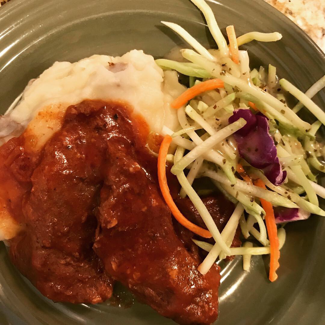 Some days are baked chicken and salad days and some days are steak and potato days. Wednesday was more of the latter (with a side salad). I found the perfect slow-cooker recipe for two (a rarity) from my Better Homes and Gardens cookbook. It uses a smaller slow-cooker so you don’t have to dirty your big one for just two or three servings!