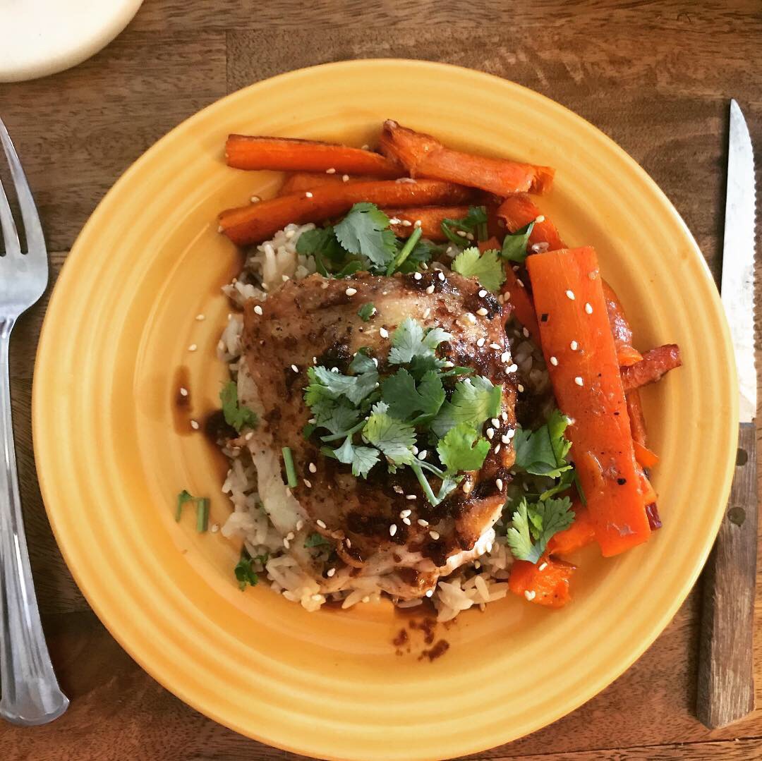 I really like chicken thighs, but I don’t usually eat two in one sitting. Last night was the exception to the rule (and I paid for it in a .5lb gain today)! The Mr raved about it, I raved about it, we wanted more. Thank goodness there wasn’t more for our waistlines’ sake. The sauce too wasn’t so gooey-sticky that we had to use multiple napkins. Also the chicken skin was perfectly crisp and the released chicken fat in the pan is what is used to cook the carrots! Can I get an amen?!