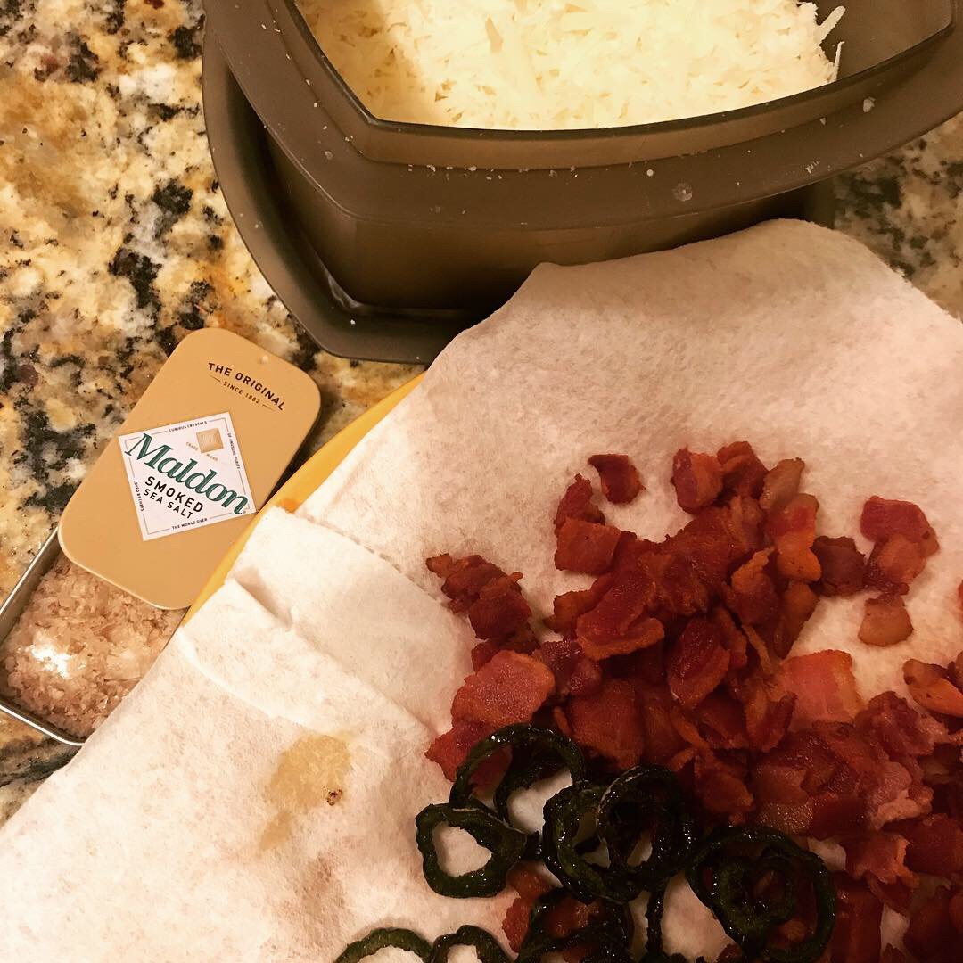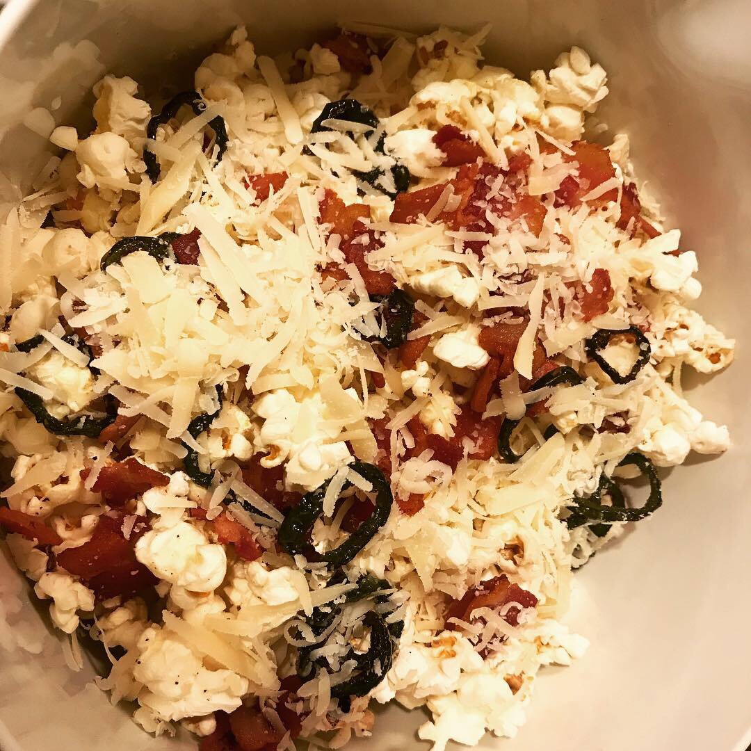 This week, for a treat, I made Guy Fieri’s Bacon-Jalapeño Popcorn for movie night on the couch. I love that it used rendered bacon fat to cook the jalapeños and the popcorn! It was finished with fresh grated parm and I added a pinch of Maldon Smoked Sea Salt Flakes for an extra depth of flavor.