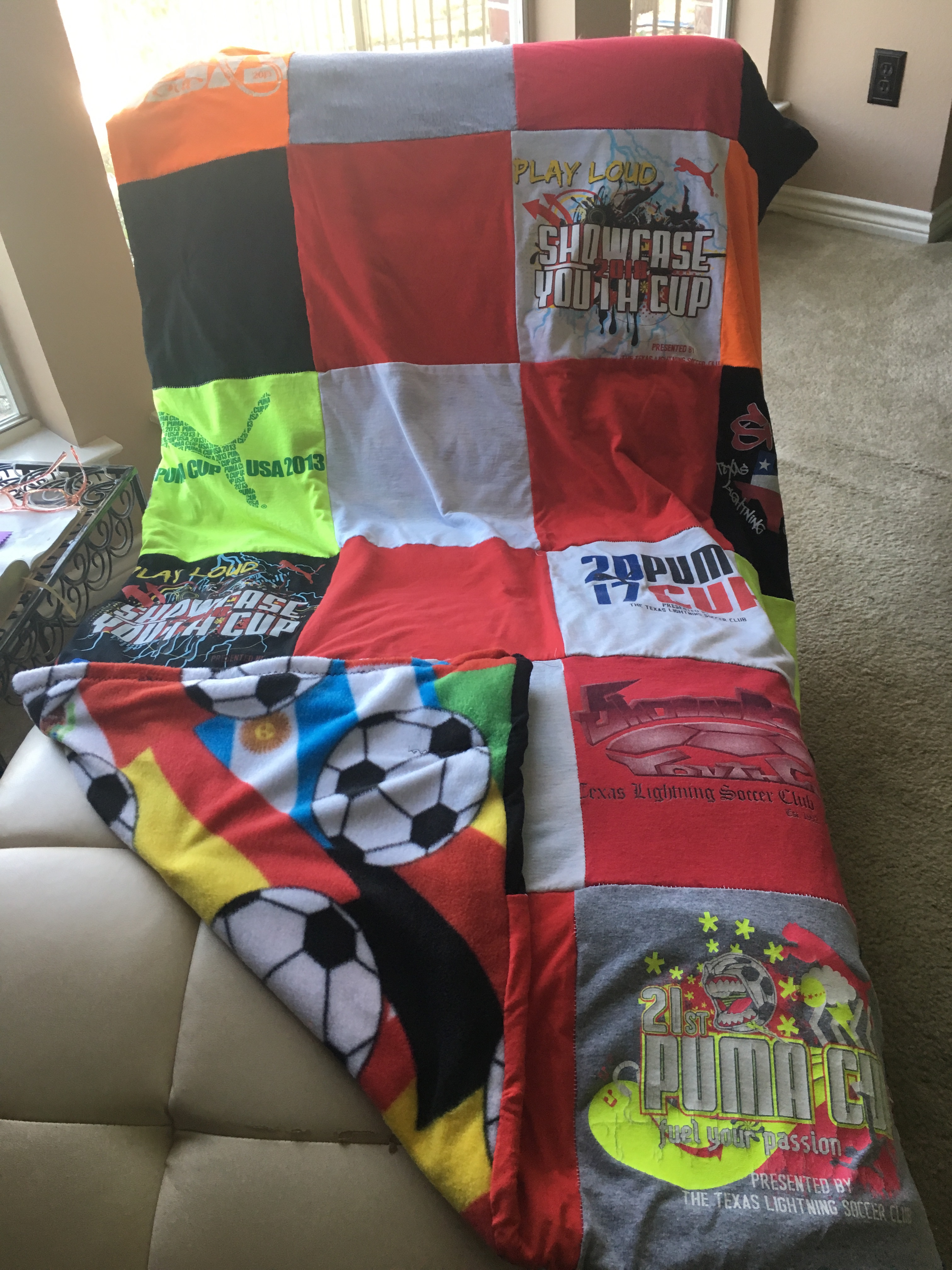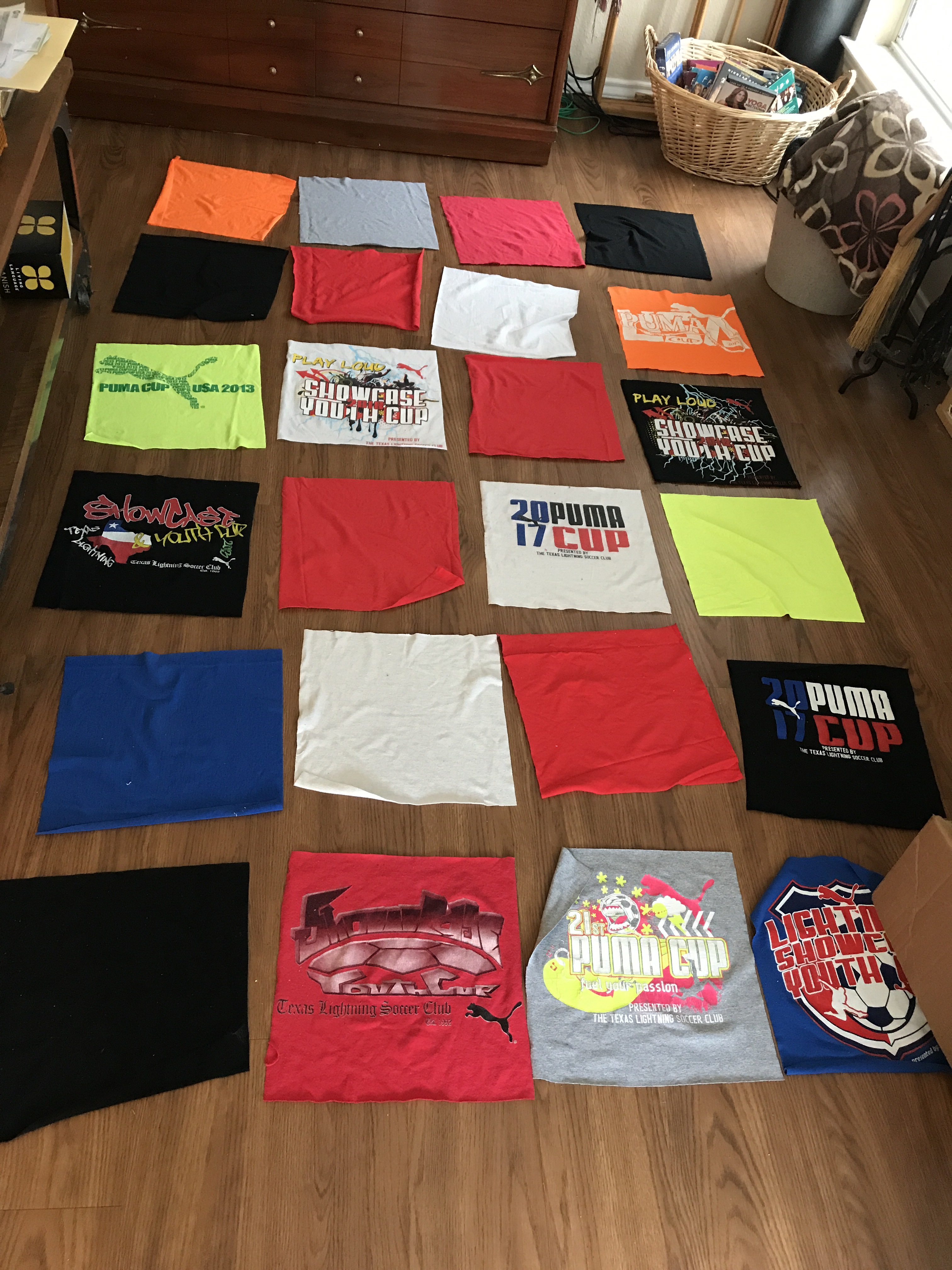 I’ve mentioned before that my MIL and her husband own and operate a soccer club int he area. They have tournaments and camps every year and with those come tshirts. We have no shortage of tshirts in our house so from time to time I siphon out some older ones and set them aside. I’ve been doing this for a few years now for a project like this. A couple Christmases ago, I used my mom’s sewing machine to make a memory quilt for the Mr using some of these shirts (as well as one for myself using my college gameday shirts) and he loved it. I ended up not using all of them, so I kept the rest aside and added a couple here and there over time.