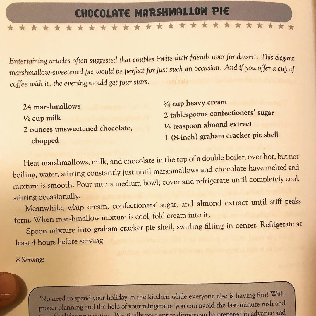 As I was going through the pages, the recipe for Chocolate Marshmallow Pie jumped out at me. I’d made something similar before and I knew he would like it. It was so simple and, true to the era, creatively written. There was a ration on sugar at that time so instead of adding sugar, the 24 marshmallows and the 2tbsp of powdered sugar were the only sweetener use in the filling. Not only was it a great pie, but the Mr (who doesn’t even like pie) polished off a whole piece!
