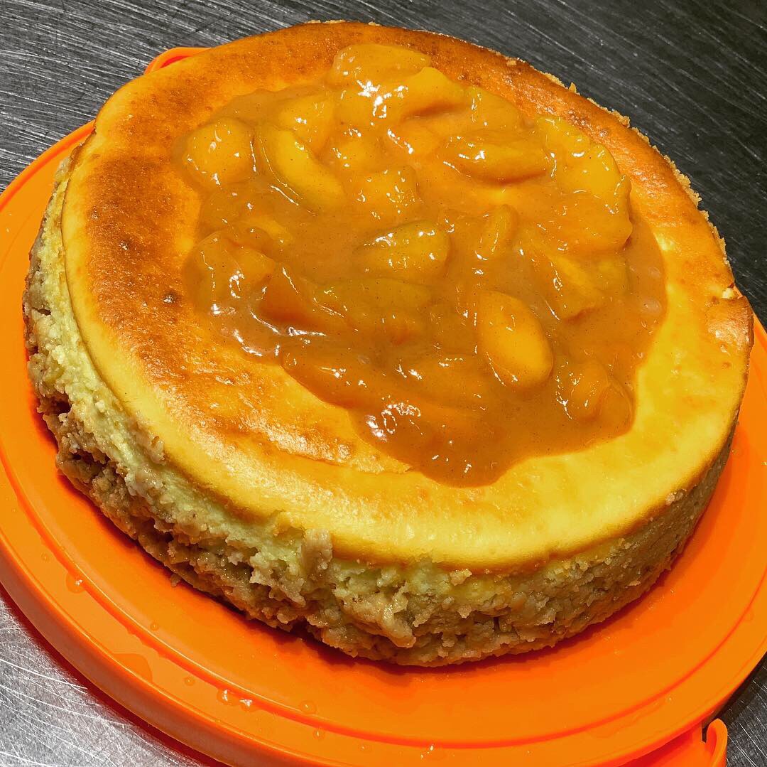 To really drive home the bright, sour notes in the crust; I changed things up a little for this recipe. I started with the Better Homes and Gardens cookbook recipe for Cheesecake Supreme. I reduced the cream cheese called for by a third and added in 16oz of full fat sour cream. I omitted the cinnamon, milk, and lemon peel. Instead of the raspberry sauce, I topped the cheesecake with a lemon curd and peach reduction.
