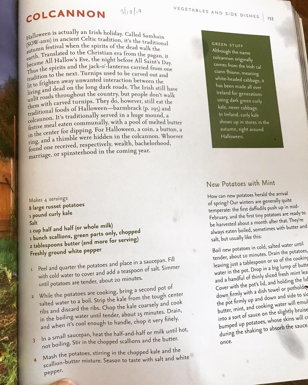 I was using a recipe out of David Bowers’ Real Irish Food: 150 Classic Recipes from the Old Country and in the description he mentioned that it was typically served at Halloween (Samhain – pronounced SOW-ann), but having made the traditional corned beef in the past, I wanted to try something different. Another thing noted in the description was that although the name comes from a phrase meaning “white-headed cabbage,” due to the abundance of curly kale showing up in the area markets around Halloween, it has been used in place of cabbage (same vegetal family) for generations now.
