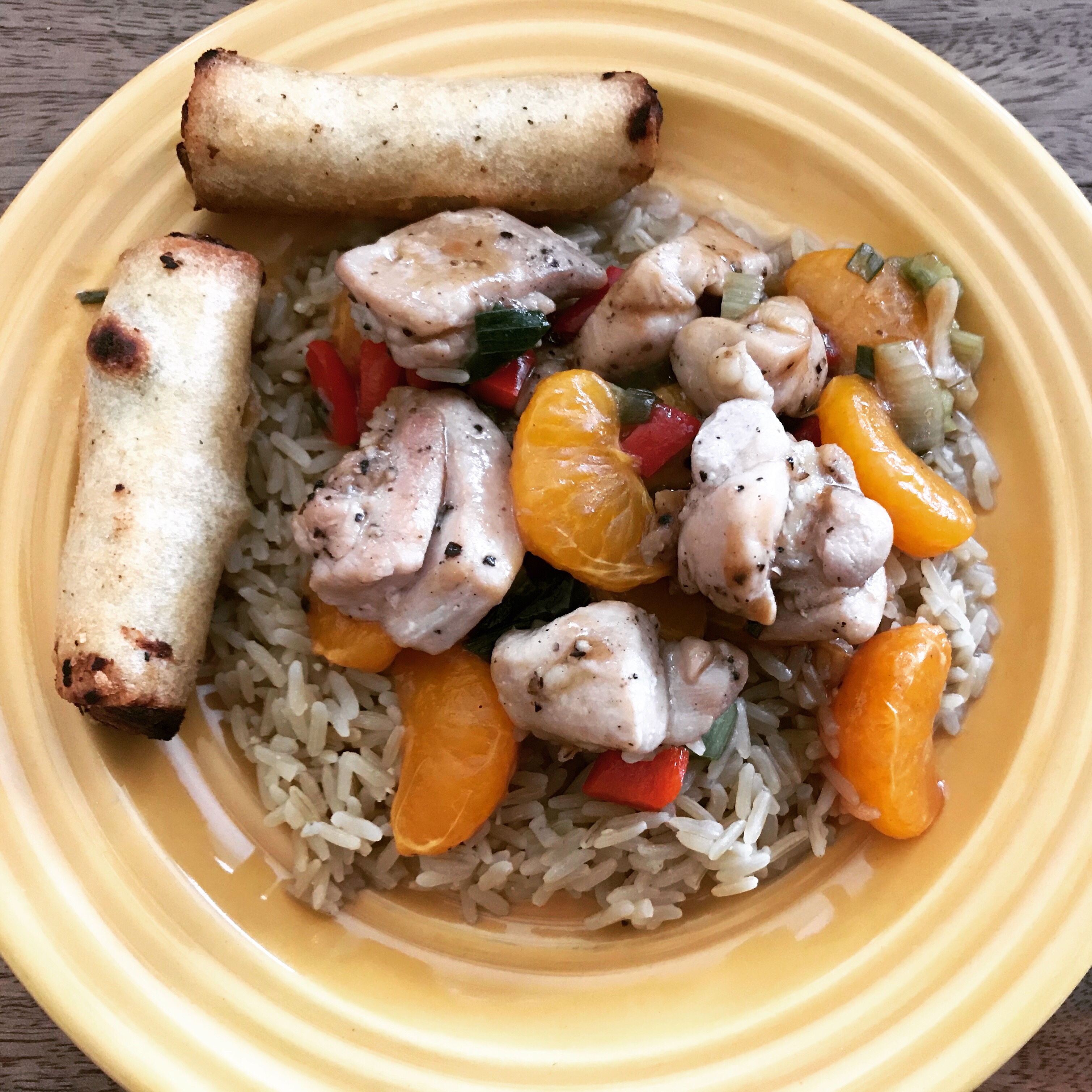 For dinner tonight, we officially welcomed Spring with Shape Magazine’s Mandarin Chicken and Sprout’s brand crispy Chicken Spring Rolls. Mandarin oranges were on sale this past week. When I got home with my bag, I promptly deposited each orange gem in a clear glass Anchor Hocking bowl on my kitchen counter. Seeing those beautiful, easy-to-peel little bites on the counter each day encouraged me to grab a couple. They keep me hydrated and help me snack a little smarter. As I’ve mentioned before, if I know I’m anticipating a great meal later, I try to moderate the rest of the day.