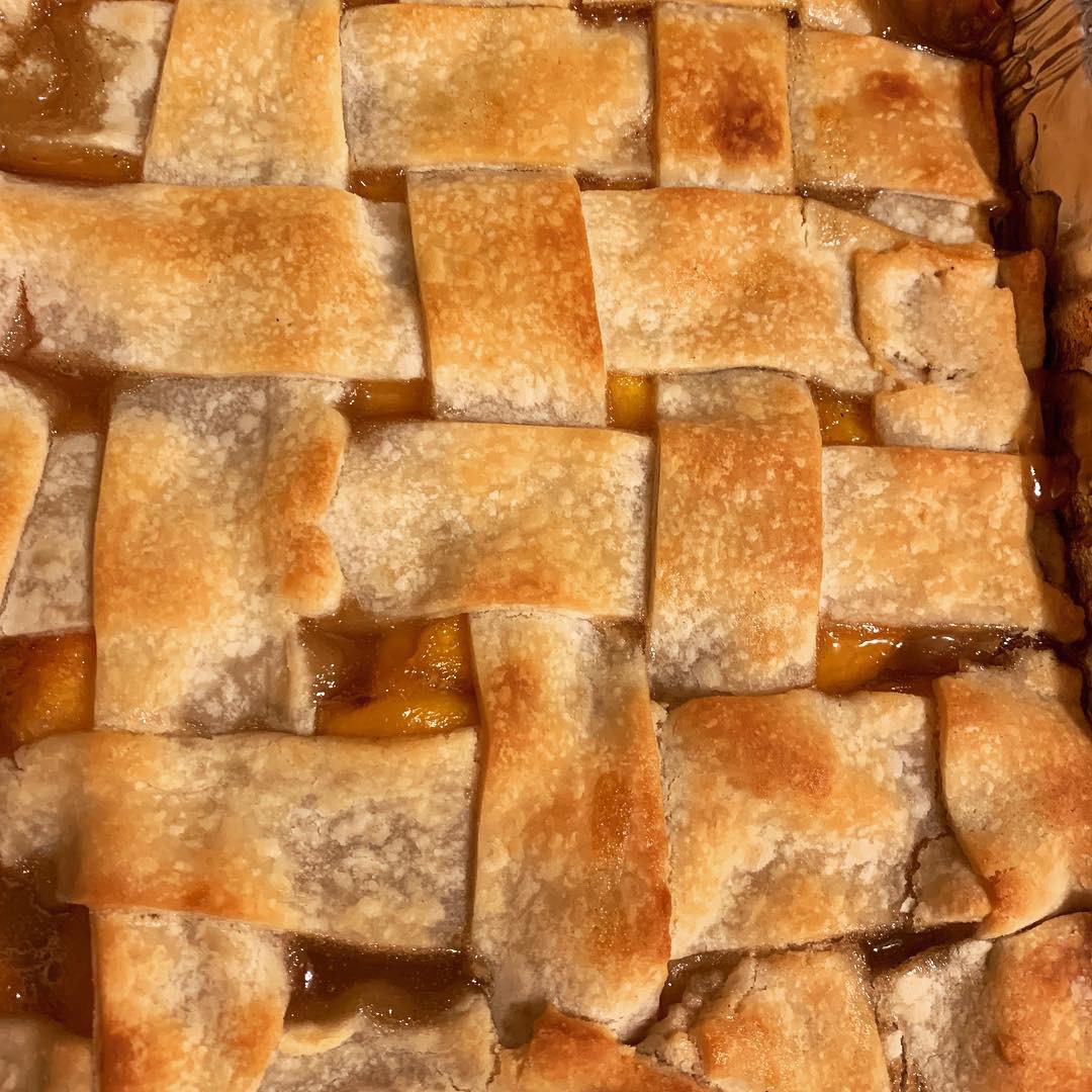 For the Peach Cobbler, I tried a new double-decker-style from my copy of Kentucky Bluegrass Winners cookbook gifted me from the Mr’s Nana at my bridal shower. It is issued by the Garden Club of Lexington. (I’ve linked my copy available on Amazon above, but if you’d prefer to obtain an updated copy directly from the source, you may find it here.) The process behind this version is unique, unexpected, and of course delicious. The filling is prepared, half is dispensed in the baking pan and a comforter of pie dough tucks it in. This layer is baked for ~10min and then the final half floods the crust and is sealed in by a lattice of more pie dough. This is baked for another ~10min. This is all well and good, but what completes the whole dish is that almond extract is used instead of vanilla which offers another unique touch that no one can quite put his/her finger on…