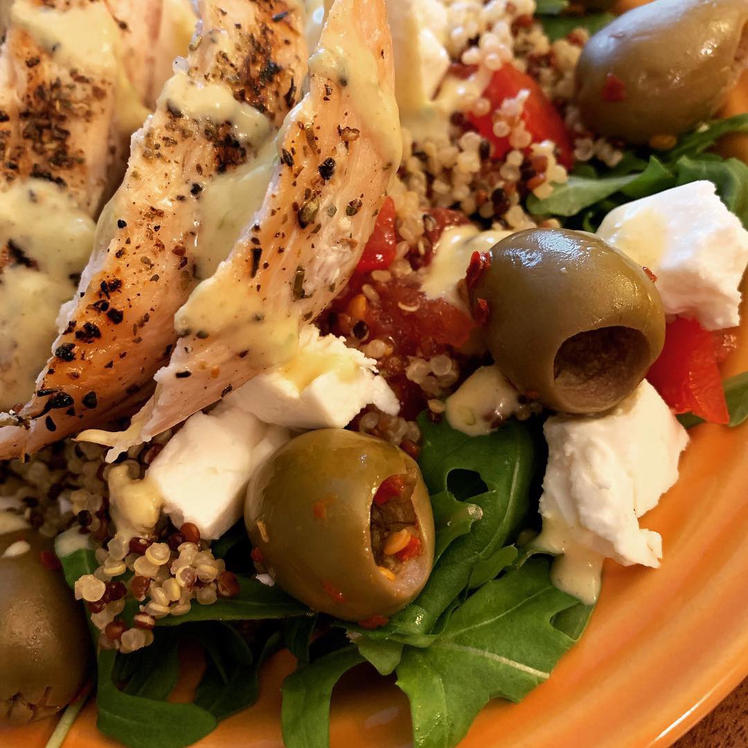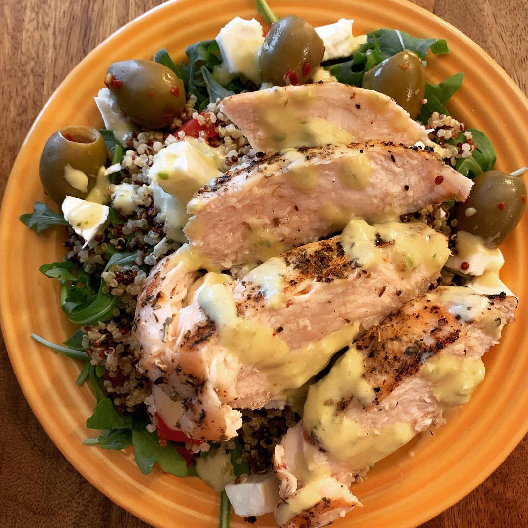 The dressing for this Chicken Quinoa Bowls from Good Housekeeping is zesty and elegant despite some of my swaps/alterations. In place of red quinoa, I used tricolor quinoa. Instead of champagne vinegar, I opted for Vilux white wine vinegar. For the olive oil, I opted for Greek Kalamata EVOO since it fit the meal profile best. Instead of grape tomatoes, I chopped up a vine ripe tomato.