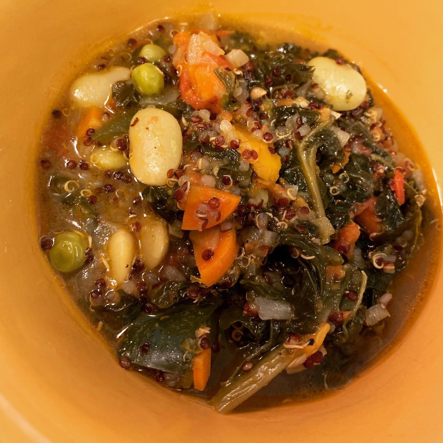 To the pot, I added two 8oz jars of homemade chicken broth and stirred to combine. After the ingredients had a chance to mingle a bit, I tossed in some cooked red quinoa along with generous handfuls (about 4c) of frozen mixed veggies and shredded kale. I brought the whole pot to a boil. Once boiling, I covered the pot and reduced heat and simmered for a couple hours. This recipe serves four to six.