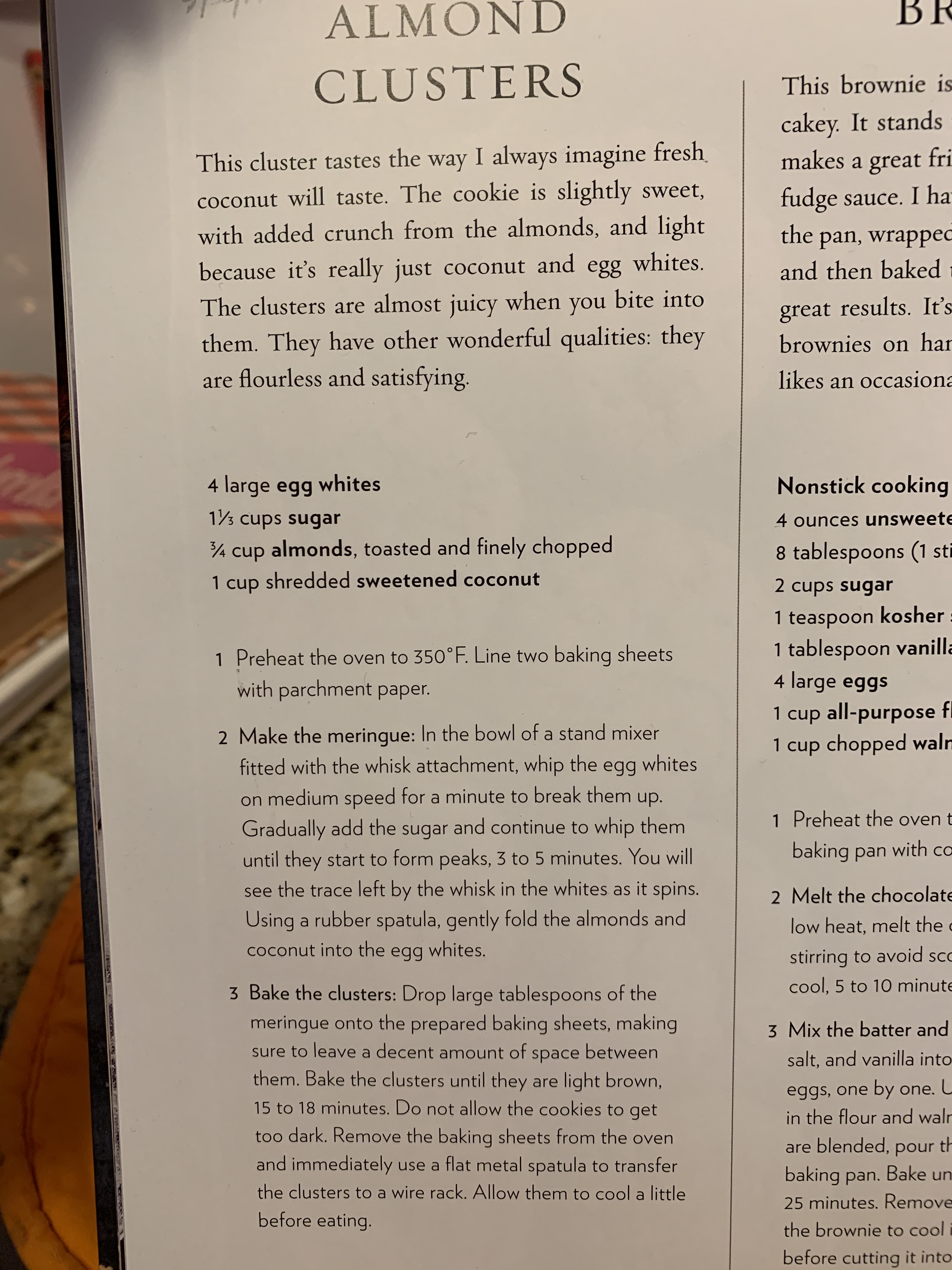 I found a super simple, low ingredient recipe in Alex Guarnaschelli’s book The Home Cook: Recipe to Know by Heart for Coconut Almond Clusters. Let me tell you, this is one recipe I definitely know by heart now. It’s only four ingredients (egg whites, sugar, toasted almonds, and coconut) and so quick to throw together. Variations can easily be made without affecting the balance and integrity of the cookies too much… Depending on the varying ingredients used, of course.