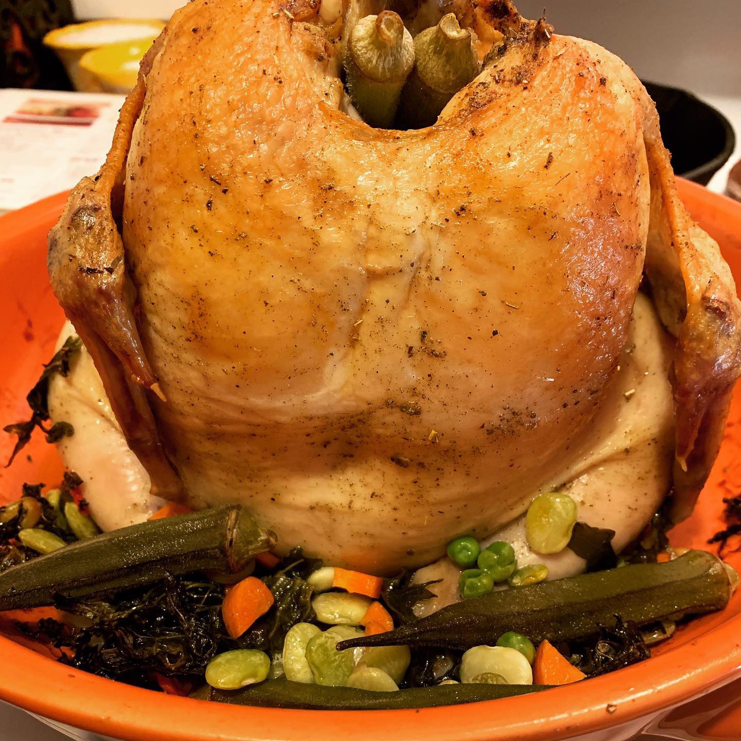 We no less organized some meals for her hospital discharge (just in time for Father’s Day) to honor such a generous spirit. It was a joy for me to break out my World Market Vertical Ceramic Chicken Roaster (in Persimmon) to roast a delicious chicken dinner for her. I filled the inner cavity with a mixture of half pineapple juice, half malt vinegar. You can put anything you want really in the inner cup; it’s mainly used to steam and keep the inside of the bird moist while cooking (like the infamous Beer-Butt Chicken on the grill).