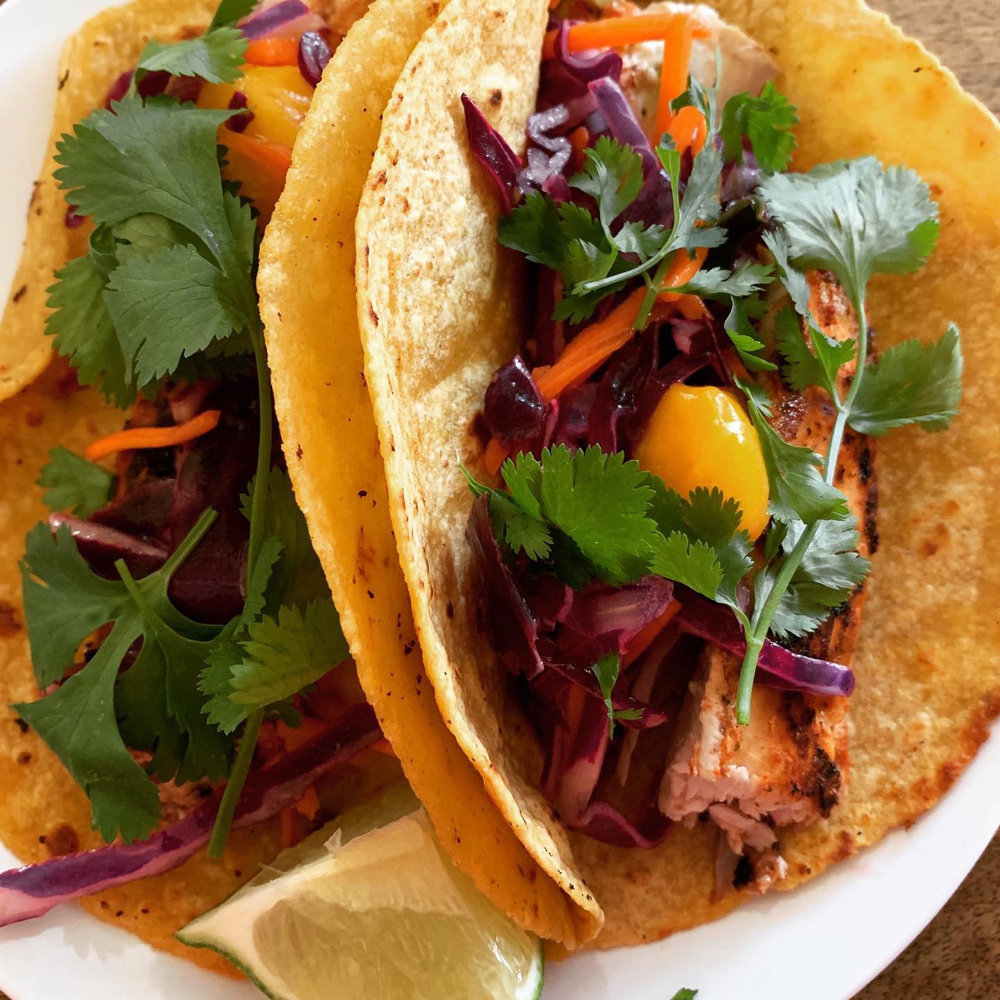 The quick-marinated fish (I opted for mahi mahi due to availability) was tasty, but I found it slightly lacking in salinity. I finished each taco with a sprinkling of Maldon flaked sea salt and a squeeze of fresh lime. The marinade would also have been really good if sriracha were used in place of the garlic salt and hot sauce. I also think the fish would be great grilled next time in place of pan-frying so no one is standing over a smoking, hot stove on a hot day! This would also add another depth of flavor to the dish.