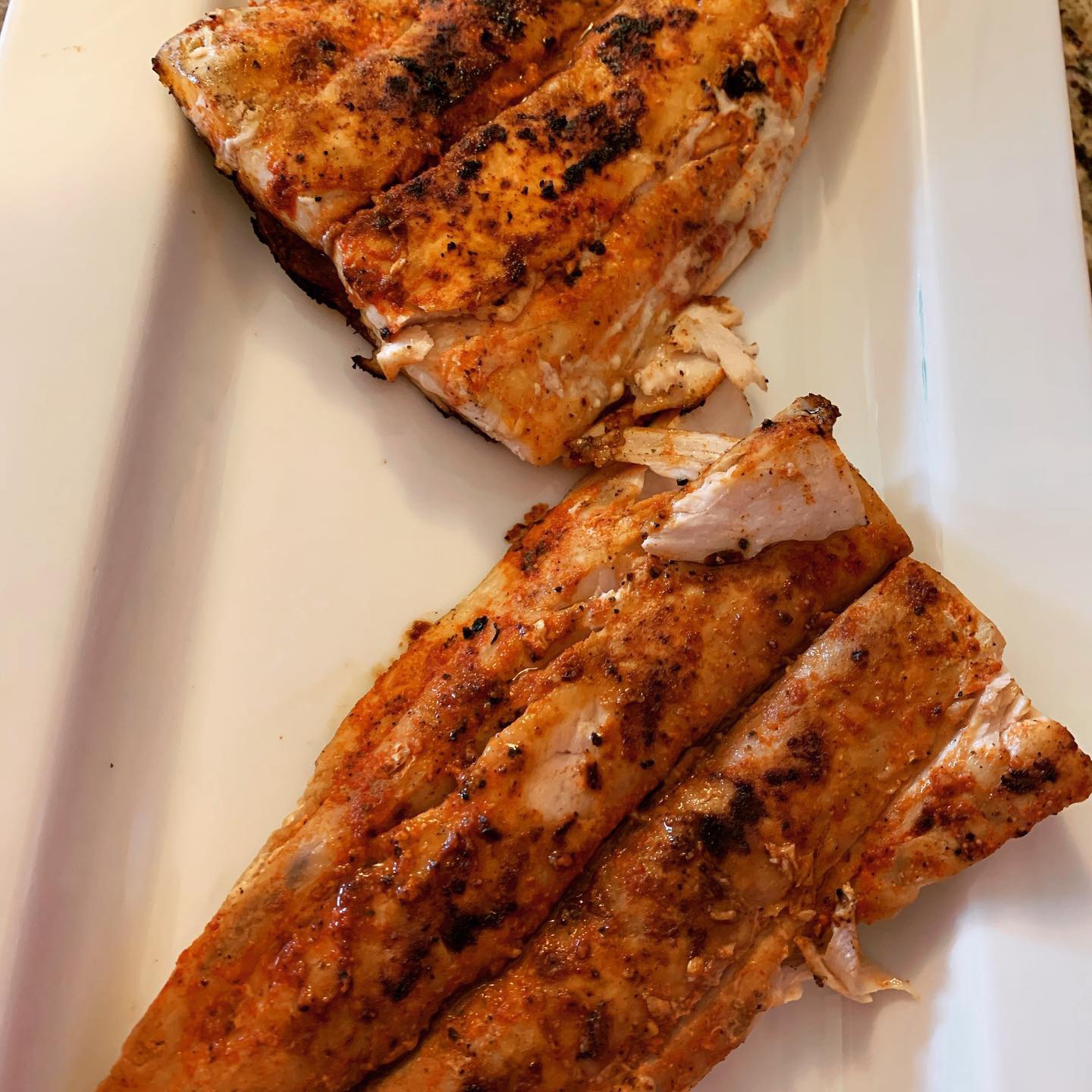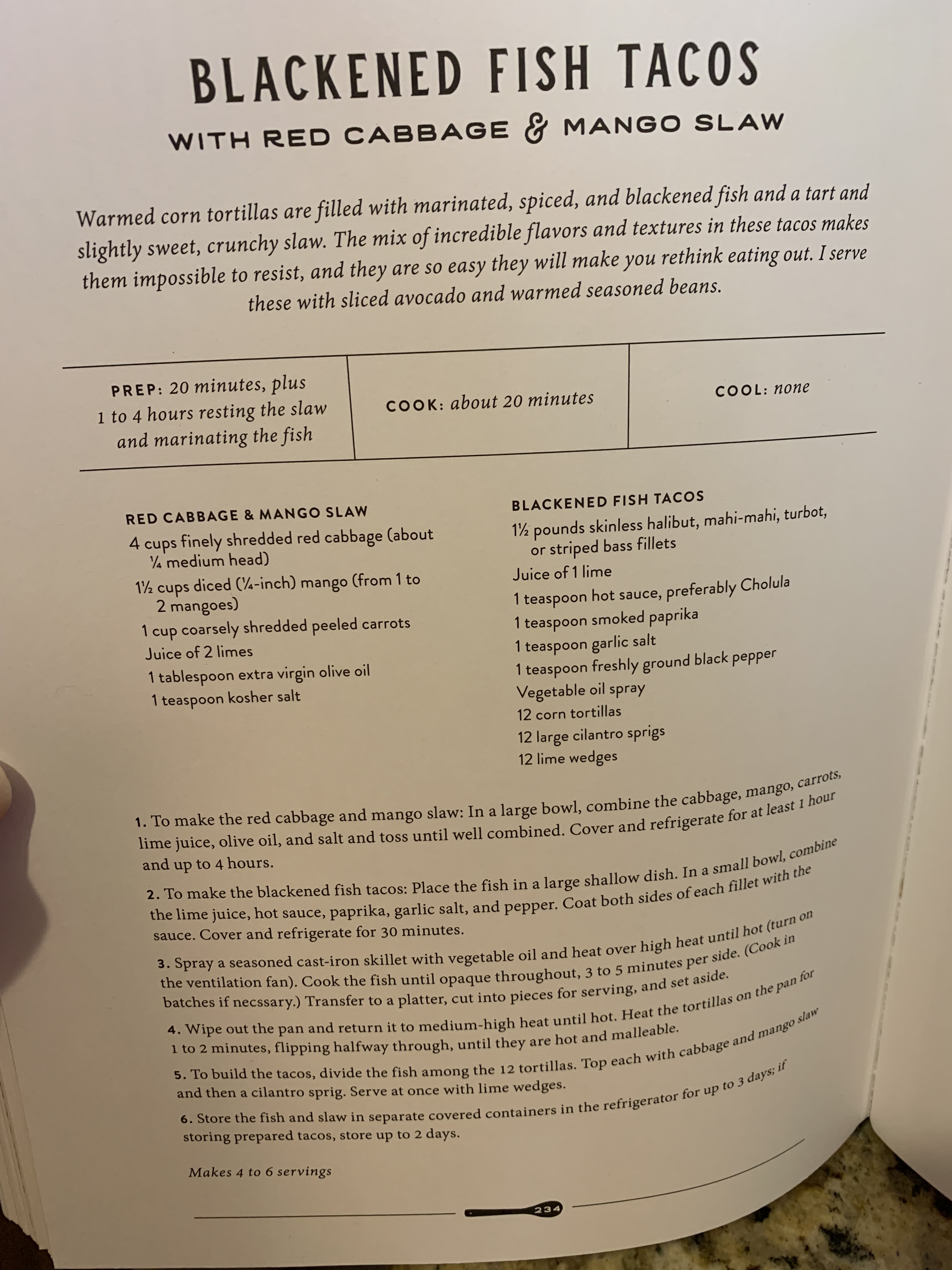 I like all kinds of tacos with all different types of toppings and ingredients. Usually I slather the dripping shredded beef with Mexican-style cheese and sour cream. Tonight though, I decided to try out Joanna Gaines’ Blackened Fish Tacos with Red Cabbage & Mango Slaw from her Magnolia Table cookbook. Not only is this recipe completely devoid of any dairy products (although these are not verboten; feel free to slather and smother as you desire); they’re also loaded with fresh, minimally processed ingredients.