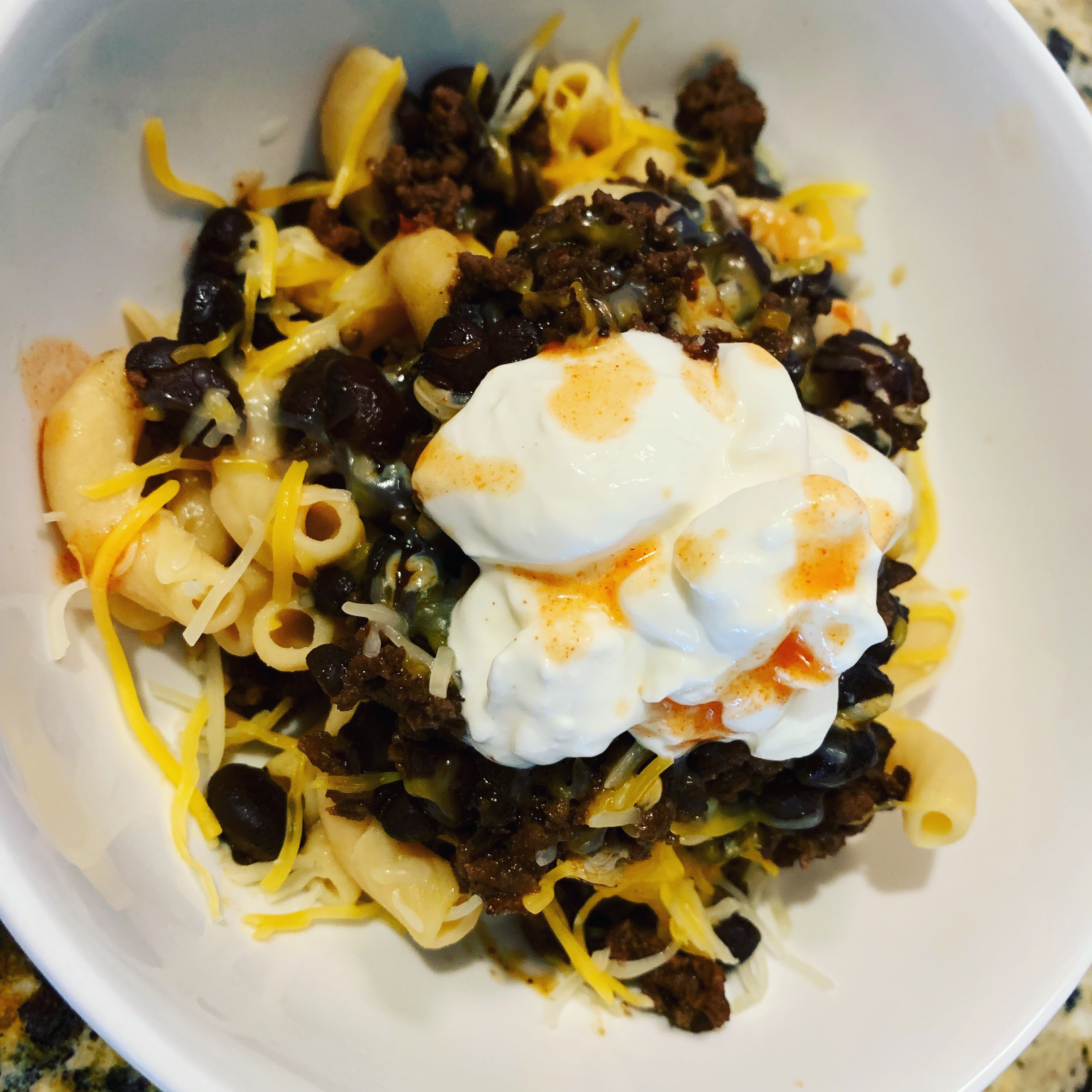 After the meat and black beans were cooked, we scooped out some of the cavatappi into our bowls and topped it with the meat and beans mixture. We sprinkled the dish with Kraft Mexican cheese, dollops of Daisy, and sprinkles of classic Tabasco! It was Chili Mac’s south-of-the-border cousin and it. was. good! Easy doesn’t have to be lifeless.