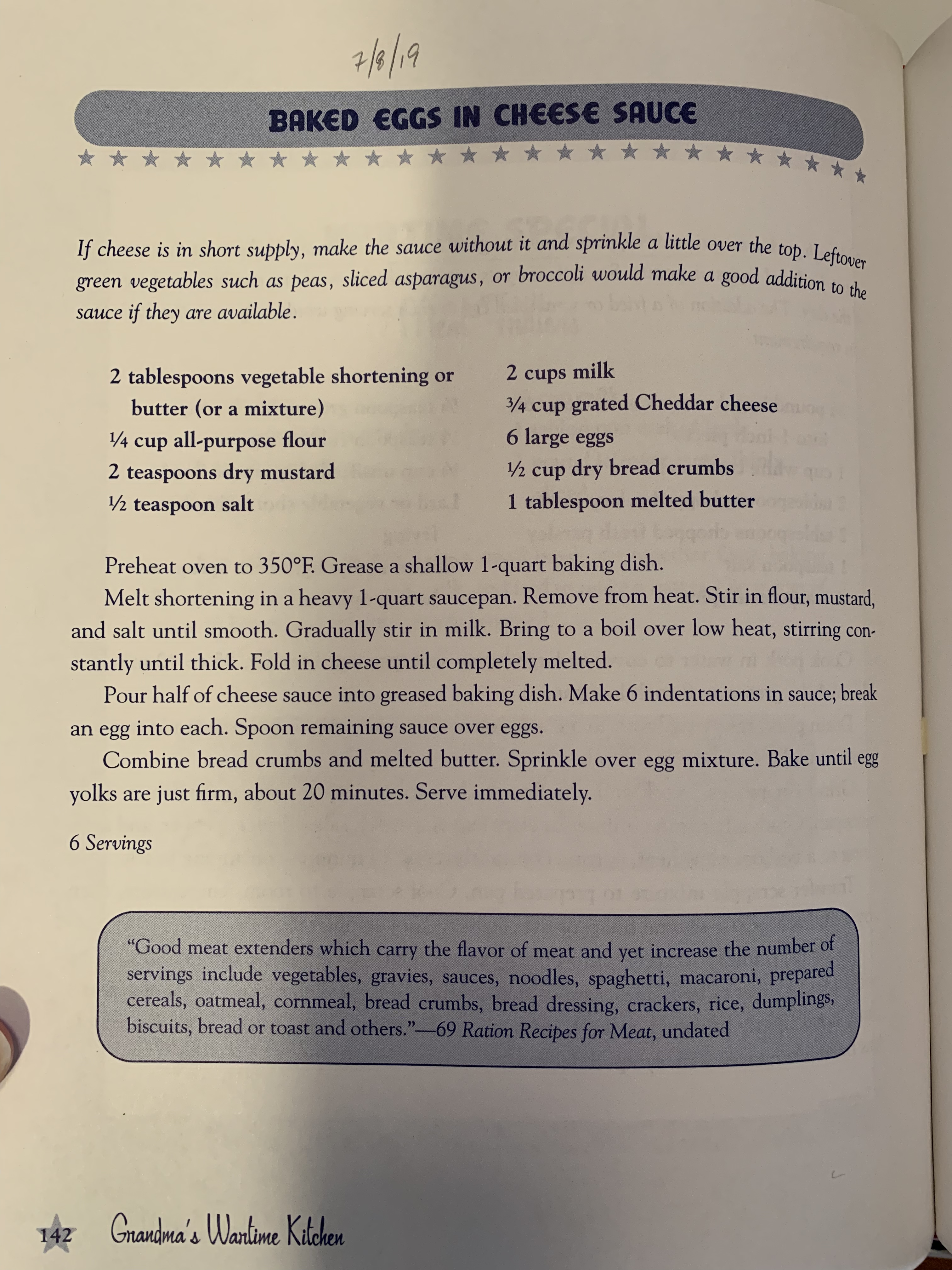 Last night, we sampled a recipe for Baked Eggs in Cheese Sauce from Grandma’s Wartime Kitchen by Joanne Lamb Hayes (a cookbook based on wartime recipes constricted by rationing). It was a fairly simple, straightforward recipe. The cheese sauce is one not unlike that which is used for homemade macaroni and cheese! As a matter of fact it was so easy, I whipped up a second batch for the side of sautéed veggies I cooked. It was based in a simple roux with seasoning added. The eggs were nestled in a pool of the rich sauce, blanketed in buttered bread crumbs, and baked until just set.