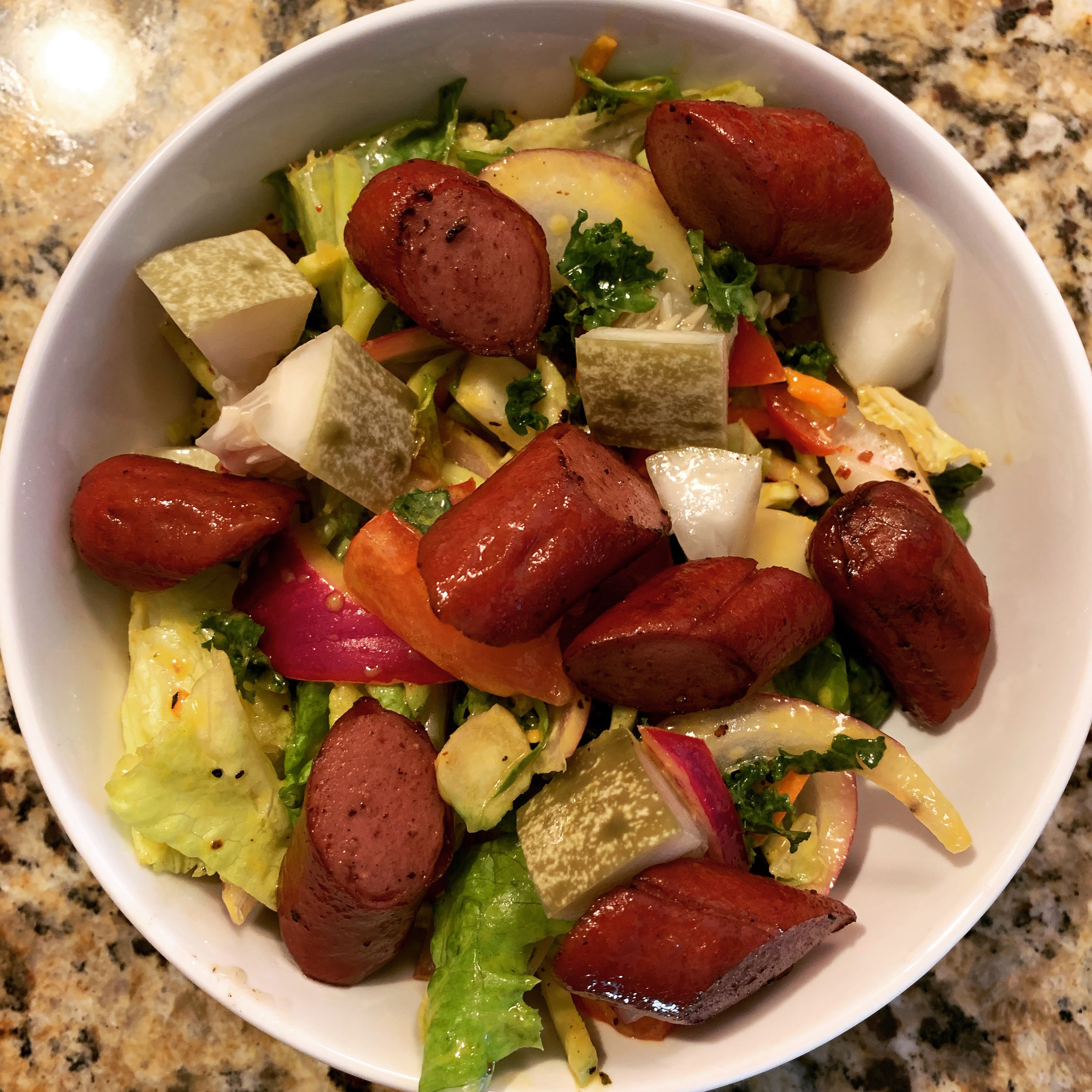 The Chicago Dog Festival may be behind us now, but that doesn’t mean we can’t maintain the spirit of the festival long after it’s passed. The only hitch is that we’ve been trying to eat a little better, eat ore veggies lately for most of our meals. This brings me to Rachael Ray’s recipe for Chicago Dog Salad! She eliminates the bun and ramps up the veggies so you can eat more guilt free!