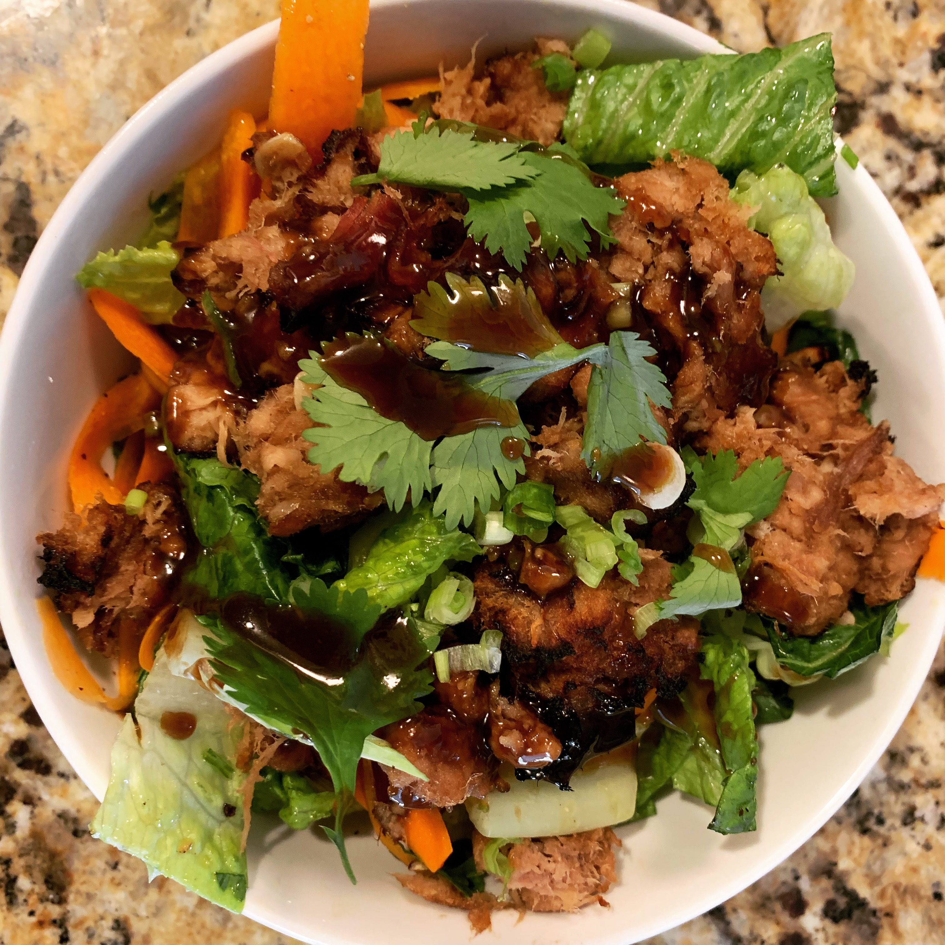 Cilantro and fresh green onion blend well with the chopped romaine, but add a little bursts of flavor with each bite. Topping the salad with the pickled veg and crisp, sweet pulled pork just warm from the oven and drizzled with hoisin sauce finishes off this dish. And believe me, we finished it off!