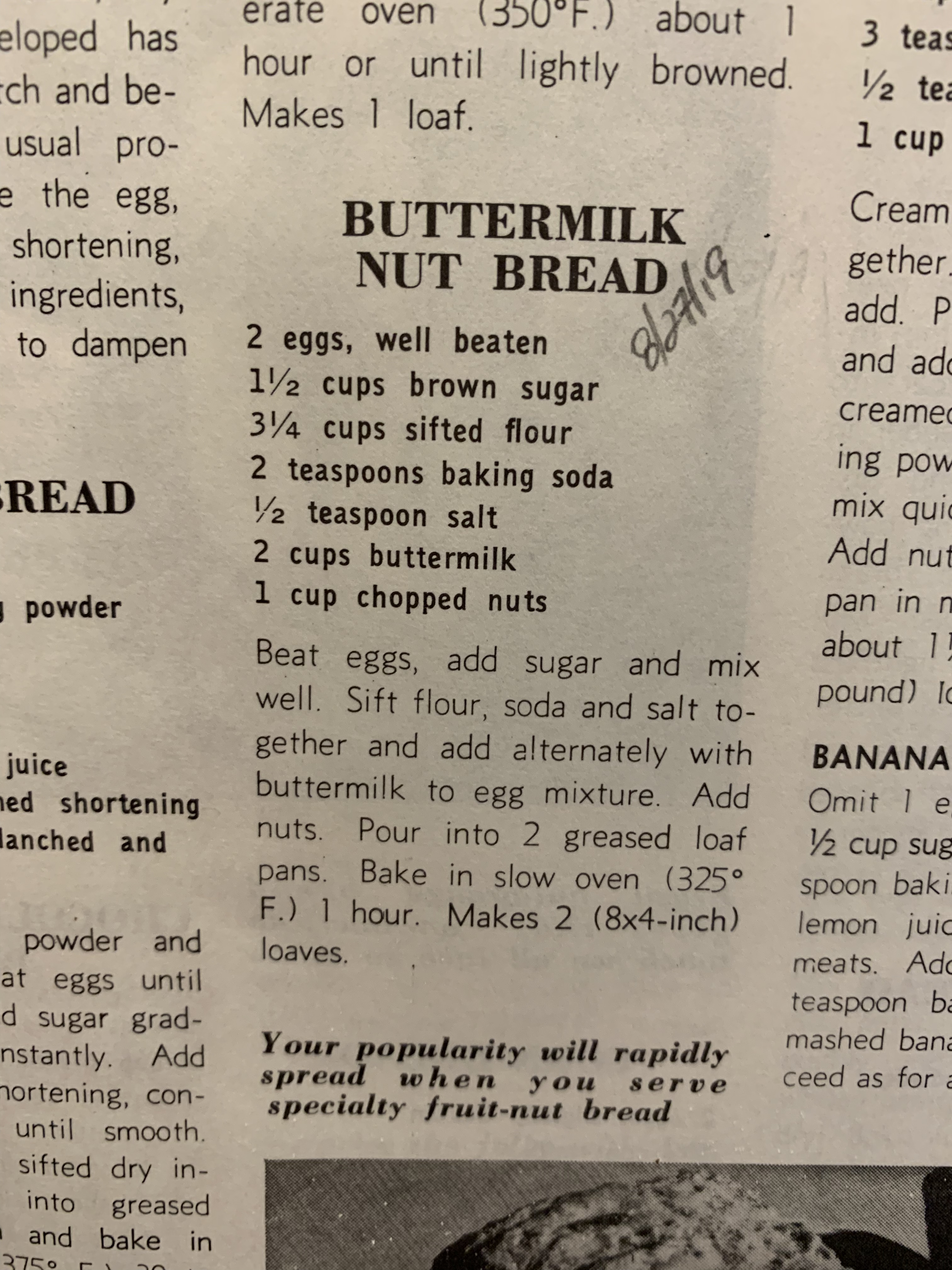 The Buttermilk-Nut Bread recipe caught my eye as I was all-too aware of half a quart of buttermilk languishing in my fridge. I needed to use it before going out of town for the long Labor Day holiday weekend. The thick, tart liquid is too delicious to let turn. Using it would ensure preventing waste, providing a delicious snack on the road, and offering a loaf to a family for which I was providing a meal upon my return. Three birds with one stone.