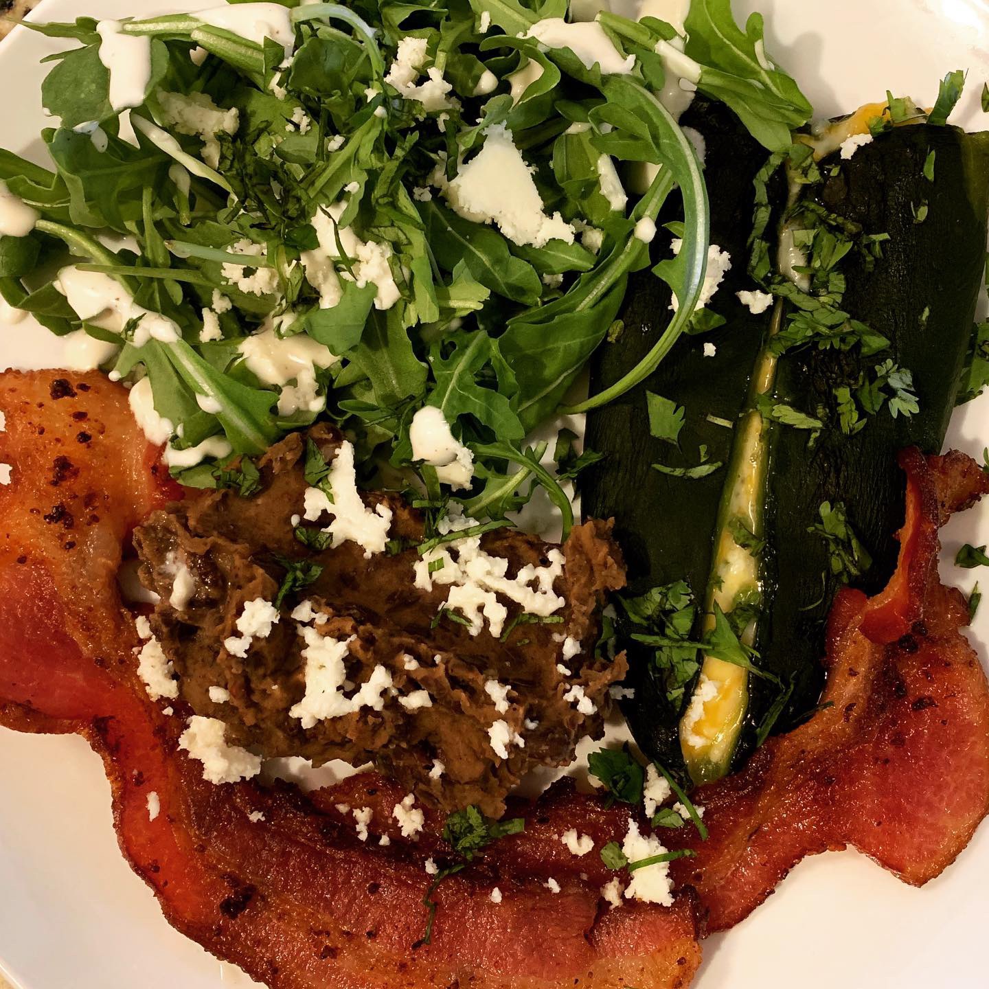 After baking the peppers to warm, cheesy goodness, we served them with a panoply of supporting cast members. Refried black beans, thick slices of applewood jalapeño bacon, a fresh green salad topped with crumbles more salty queso fresco, and a littering of chopped fresh cilantro. The whole meal felt crisp and animated using fresh ingredients and one for which I’m tempted to break with tradition again…