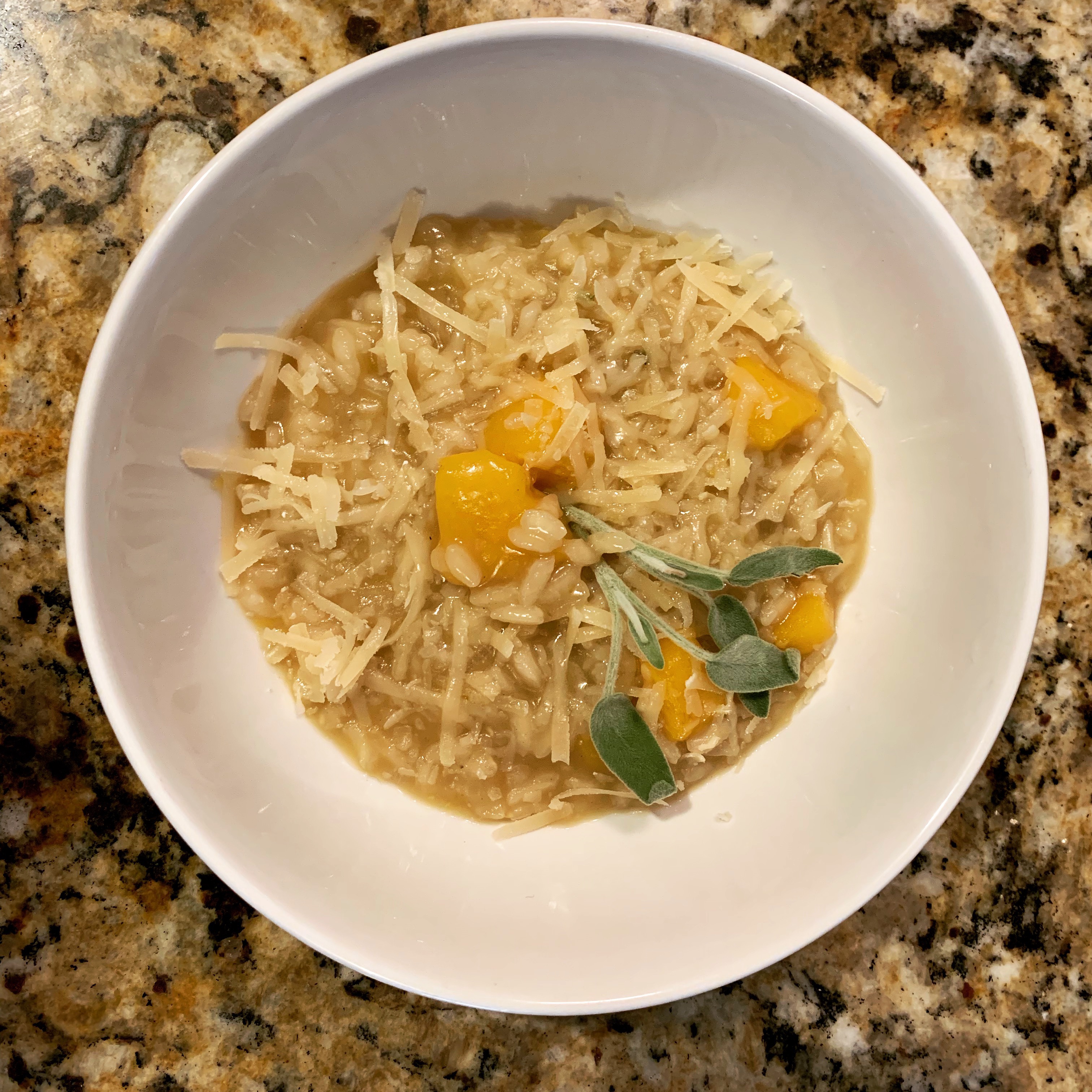 To celebrate, I knew I had to cook something so seasonal and delicious! Last night’s dinner was definitely seasonal and delicious even if it was above 90° out. With pie pumpkins in abundance this week, I quickly scooped one up to try a fresh, seasonal take on an ordinary risotto. If you don’t know what risotto is, you are seriously missing out. Risotto is a heavy, Italian rice dish cooked low and slow with plenty of doses of broth and often cream to bring about a hearty meal. It can be served as a side, a blanket for a protein, or a complete meal itself.