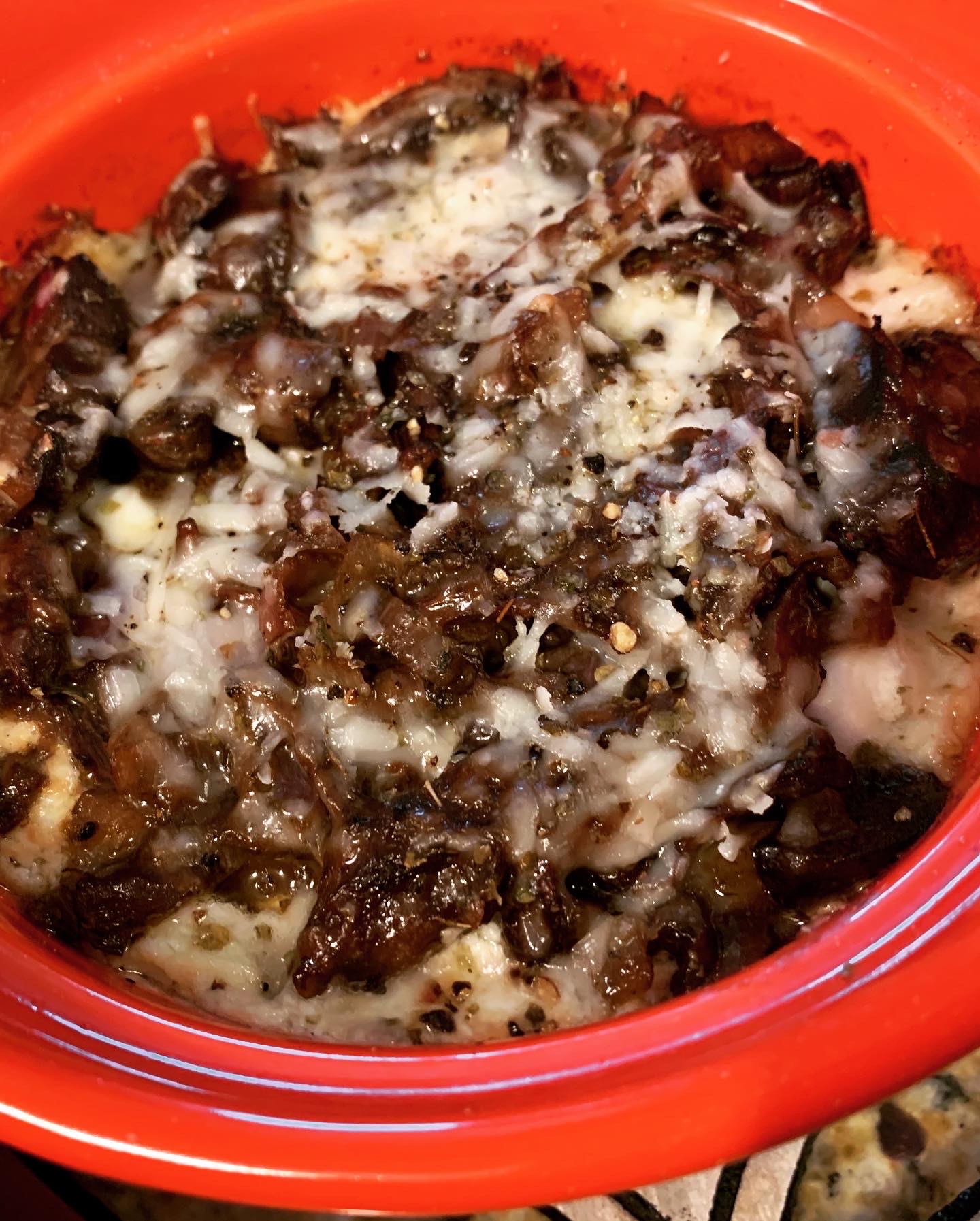 The recipe said to combine the ricotta and cream for the layers, but I also smushed in the burrata instead of reserving it for dotting with the mushrooms. I did this out of a desire to minimize steps and use of counter-space. Just a personal preference. I’m sure it would’ve been just as amazing as written.