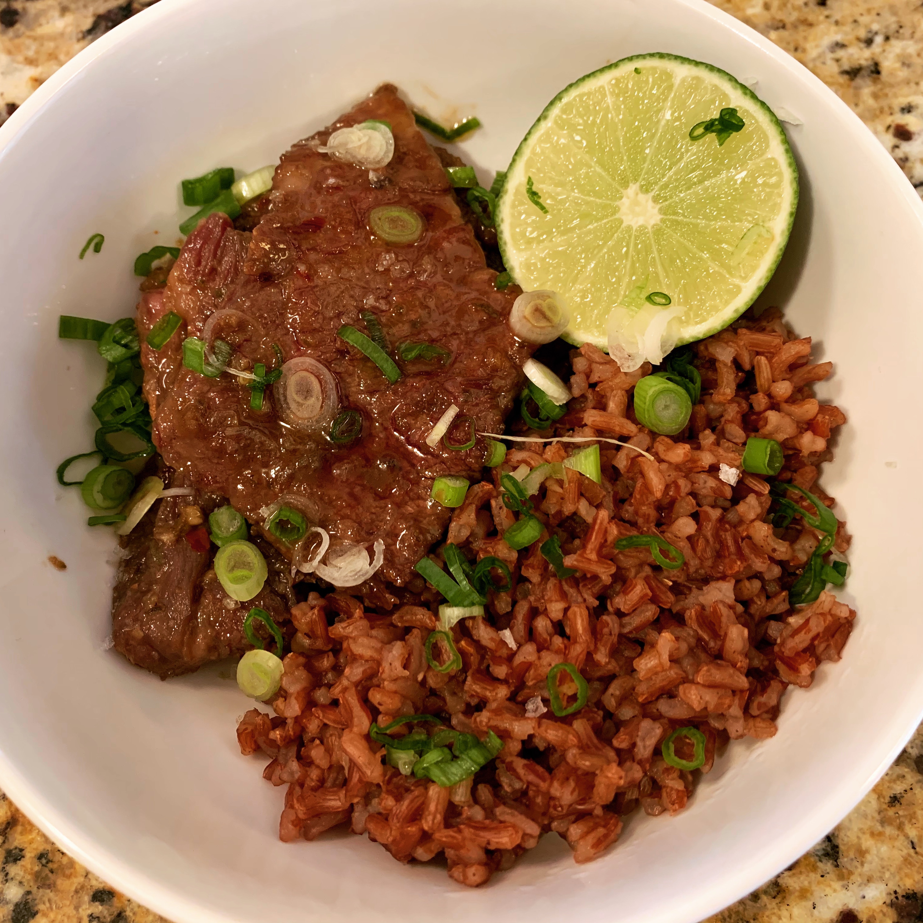 We served ours with plenty of chopped green onions and with some Lotus Organic Red Rice cooked in Better Than Bouillon Roasted Beef Base. The inherent nuttiness of the red rice complemented the sesame oil in such a harmonious way. Years ago, I switched from cooking grains in water to cooking grains in broth. The flavor has a chance to cleave to the individual grains and stick around this way. If you do this with white rice, you won’t end up with pretty snow-white rice, but it’ll sure be delicious!