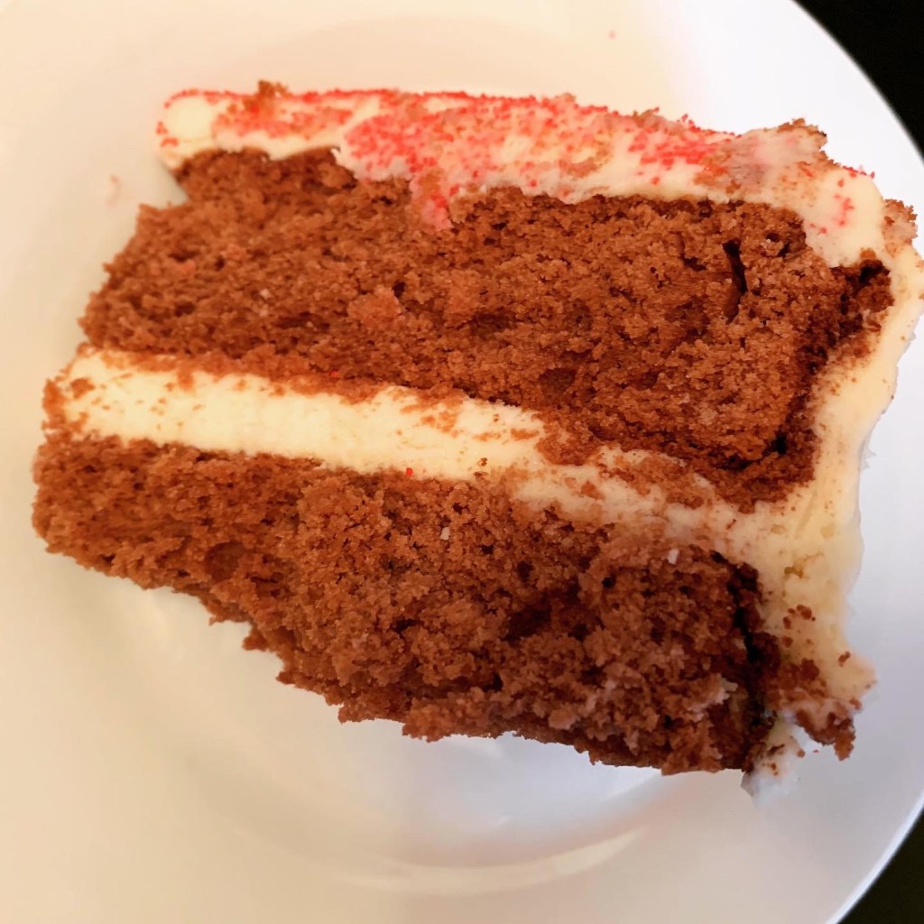 One thing I did alter was that I increased the buttercream by approximately 50% in order to frost the cake with an adequate crumb coat and finish with a second coat for aesthetic reasons. I then finished the top with a generous dusting of red decorating sugar. I so wish I’d gotten a candid of the perfectly imperfect adornment of candles placed in the cake by my sweet 4-year-old nephew!
