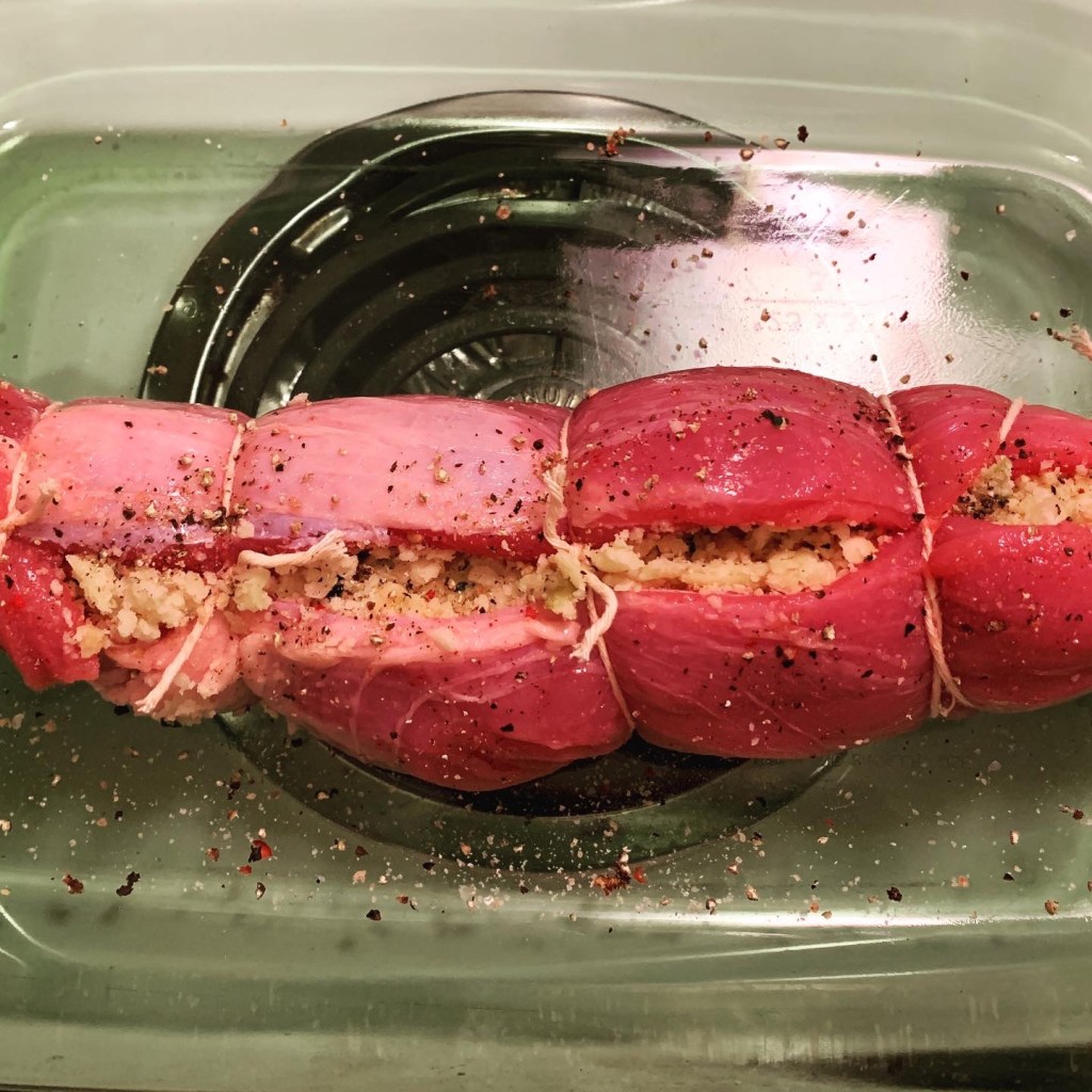After making stuffed pork chops last week for St. Patrick’s Day, I had a good bit of stuffing left over so I packed it away in a freezer bag to freeze for later. I don’t ordinarily recommend this due to the possibility of cross contamination, bacterial growth, etc, but I was able to estimate my usage for the pork chops and not contaminate the entire batch. I don’t like waste and the same page that the pork chop recipe was on, also gave a tip for stuffed pork tenderloin. so win-win!