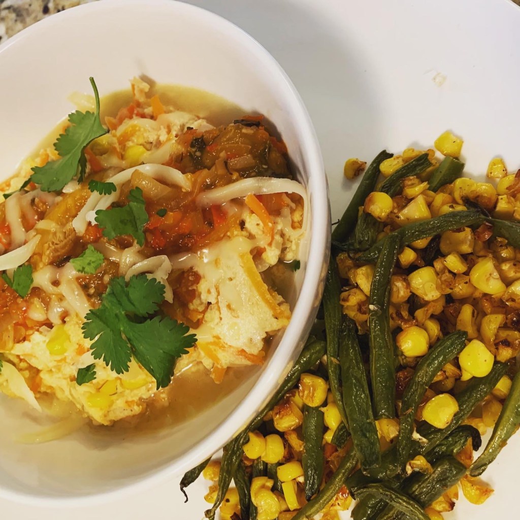 While it’s true that polenta can come in the form of a solid, baked dish, this dish in particular came out more like an egg and cheese casserole with an identity crisis (Mexican, Italian, and Asian ingredients) than a baked polenta. While I was at my part-time gig today, I managed to scoop up the necessary ingredients to create my (albeit unhealthy) own version of this dish.