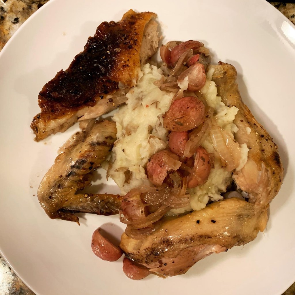 I like any recipe that calls for smearing a semi-soft butter compound beneath chicken skin, but this recipe takes it further with the anointing of melted butter and a dusting of classic S&P. I even went one step further and sliced up a Meyer lemon and stuffed the cavity before tying up the drumsticks. I often take the extra step to stuff the chicken cavity in order to maintain moisture and further flavor the chicken from all sides. The lemon was in the rub and in the cavity and it absolutely permeated the entire dish.