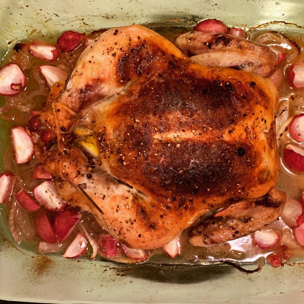We really enjoy sauteéd radishes and their tops, but frankly I didn’t care for the radishes in this roast. I know they weren’t meant for a next step in a Panzanella salad; but unlike many other days when I’m not working my part-time job, I wasn’t in the mood to pull off a 3-recipe meal. It was late and I had to be up early for church, so I just thought the roasted radishes and onions would be fine. The onion turned out quite lovely cooked in the bright garlicky-lemony-thyme chicken broth! But the radishes on the other hand… In my humble opinion, small baby red creamer potatoes would have suited this better. They’re so creamy and pair so well with roasted meats! Sidle up with a serving of fresh green beans or steamed broccoli and you’ve got yourself quite a meal!