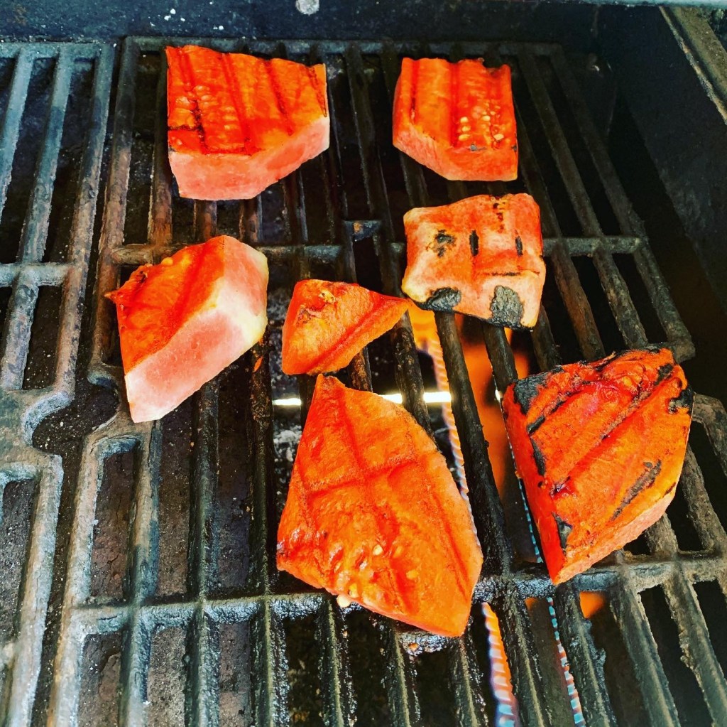 Are you done with my bashing watermelon yet? That’s ok. I’m getting to the good(ish) part. Lately, I’ve been seeing lots of grilled and/or savory watermelon dishes meandering through my feed. It hasn’t barreled on through and taken the health world by storm like our friend kale has, but it’s quietly held it’s own, elegantly stepping in here and there. It makes a statement, evocative of something new and unexpected, yet it gently supports whatever it has been paired with. Buttery grilled peaches with homemade ice cream are a showstopper, whereas grilled watermelon is completely at ease being a supporting character in the grand menu.