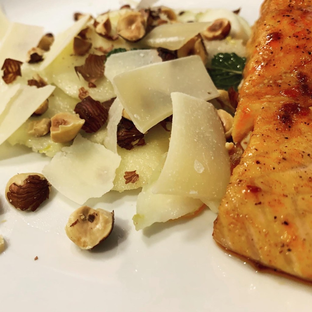 The salad was a different type of salad than we’re used to. Less lettuce, more mixing of fruit and veg and bright, sharp flavors of crisp apple and zesty lemon. It was all freshened by hints of fresh mint (from my garden – thank you very much) and brought back down to this stratosphere by the crunchy, nutty, earthy notes of toasted hazelnuts and salty umaminess of shaved pecorino romano. I paired the salads with portions of baked salmon to further send the fresh flavors of the season home. The whole meal was light and refreshing and great for a quick weeknight meal for a muggy summer evening. (Sure, apples aren’t exactly in season at this moment… but boy did it send this dish over the edge!)