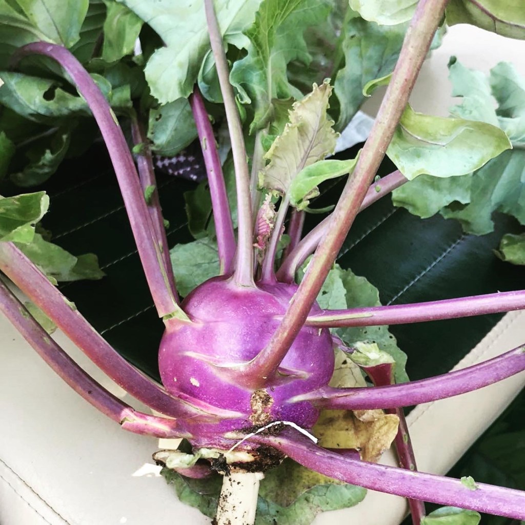 Recently, a sweet friend from church blessed us with some of the bounty from her garden. She had even planted some things she didn’t know anything about at the insistence of her husband and wow! All the work of her hands has certainly been blessed! One of the things she’s planted that has been flourishing in her garden is purple kohlrabi. Purple kohlrabi is a bulbous vegetable that looks a little bit like an alien. It has the faint scent of radishes when you cut into it and tastes subtly of turnips and broccoli. And it is, in fact, a bright, beautiful shade of violet!