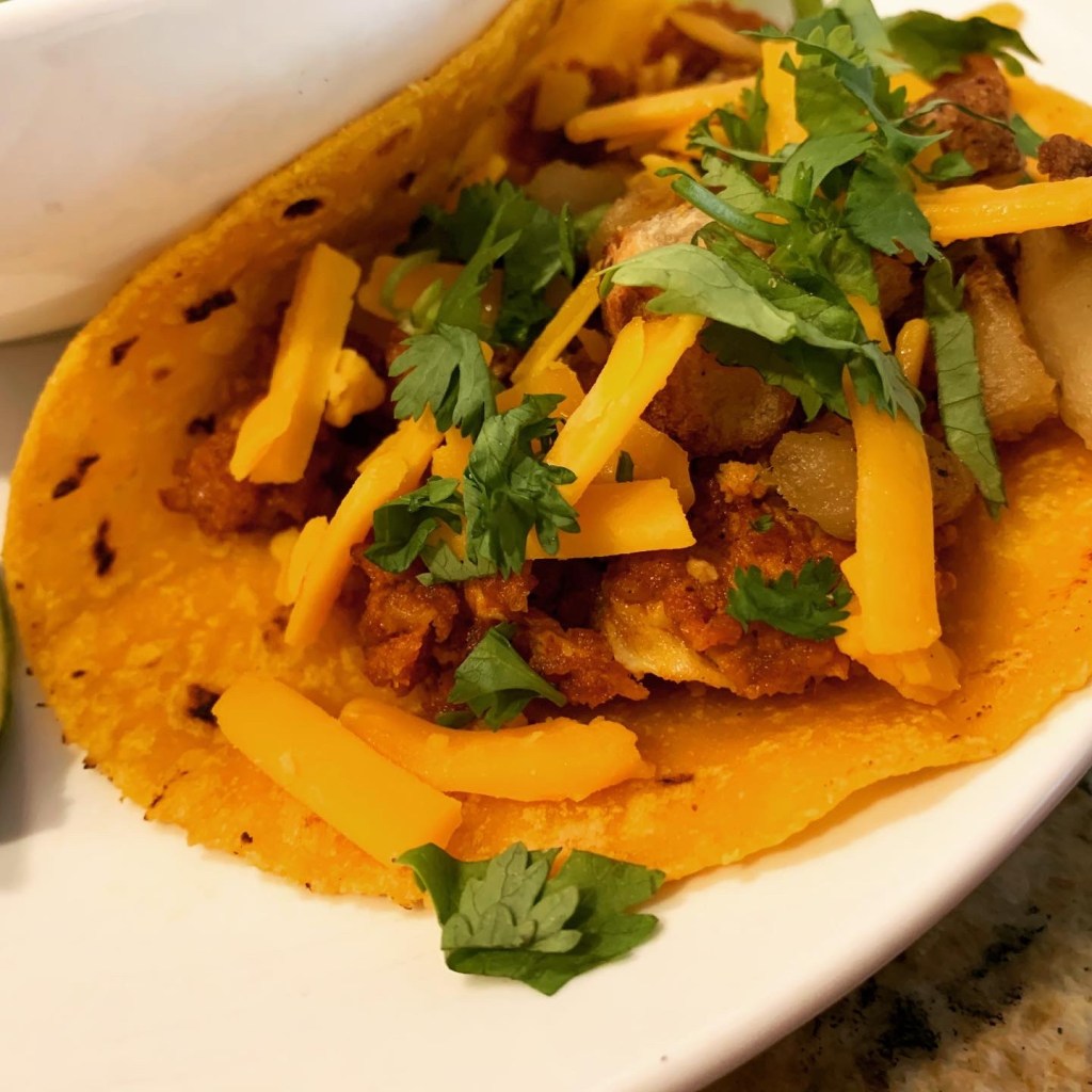 We enjoyed our soup with crispy potato, chorizo, and egg breakfast tacos. I grew up eating chorizo and it mixes so well with eggs and sharp cheddar! The crispy potatoes, cooked in delicious duck fat, added the right amount of crunch to play off the soft texture of the fatty eggs and Potapas Sweet Potato Tortilllas. About those crispy potatoes… I diced up one russet potato into 1/2in cubes and fried themin my trusty Lodge cast iron skillet in 2tbsp of duck fat for 10min. Then I tossed them in kosher salt and dusting of garlic powder and spread them on a baking sheet to bake at 400° for 15-20min. So simple yet so divine! Nothing beats crispy duck fat potatoes!
