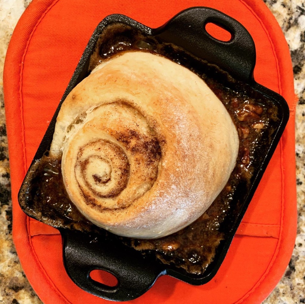 Reminiscent of thick pecan pie, the pecans are spread in a generous layer on the bottom of a 12in cast iron (I used foil pans and individual cast iron servers to make these easier to give away as gifts). Then a batter comprised of butter, brown sugar, honey, vanilla, and whiskey (a good replacement here is orange juice or even more vanilla if you’d prefer or don’t have whiskey) is whipped and dolloped atop the pecans. The whole mess is brought to a sticky, melty, bubbling sauce in the oven and a bloated pinwheel of cinnamon-and-sugar-laced dough is placed right on top. Let it rise and bake. The final flip is where it’s at. This step sets it apart from your average cinnamon roll.