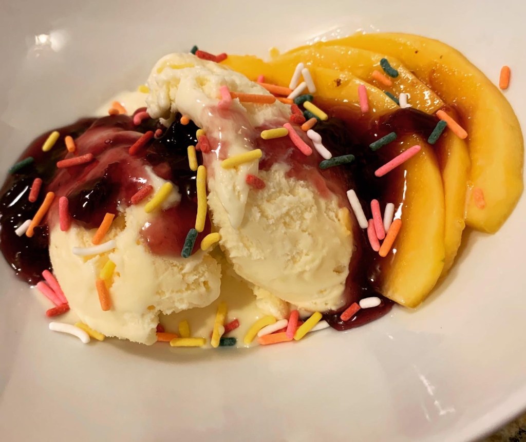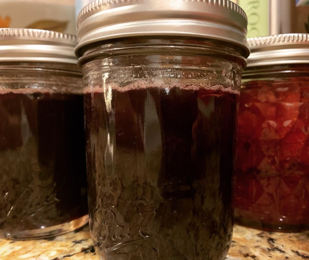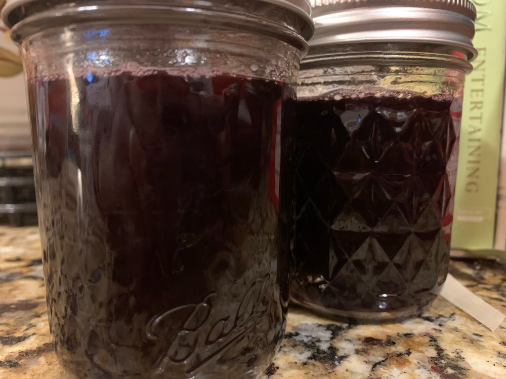 The finished product was tart and aromatic with a sweet, smooth texture. It was perfect for blanketing on some buttermilk biscuits with my coffee the next morning. It also made a fantastic PBJ on brioche for lunch as well! (Can you tell by now that we’re partial to brioche around my house?) For dessert that evening, we topped some scoops of vanilla ice cream with drizzles of grape jam! It’s even delicious straight from the jar! It’s an all-American, versatile treat. The recipe says it makes 6 half-pints, but I was able to squeeze 7-3/4 out of it measuring with a 1c measuring cup when filling the jars.