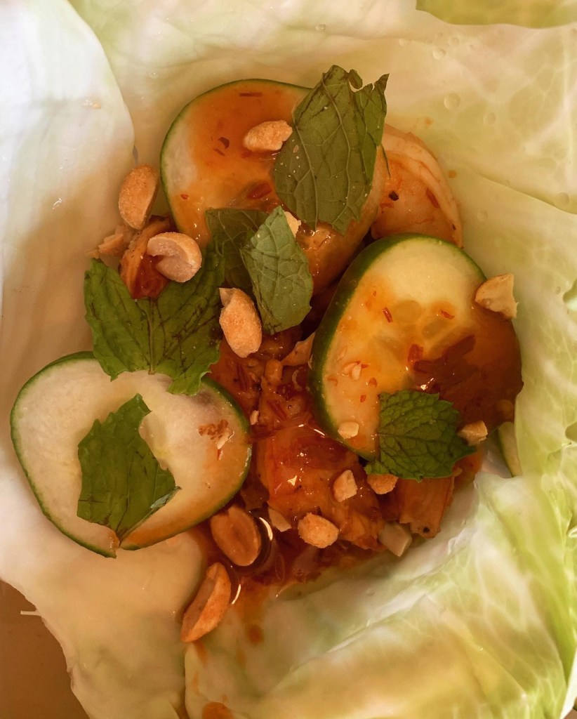 I used fresh mint from my garden. It gave the dish a fresh burst of lightness to balance the heat of the chili paste and the umami from the sesame oil. The chopped roasted, salted peanuts gave a different element of crunch (contrasting with the softer crunch from the cabbage) and saltiness. I paired the meal with the rice cooked in vegetable stock in my Pioneer Woman Instant Pot and dusted the whole with Maldon flaked salt. This dish (with the halving of the chili paste) is honestly delicious and well worth branching out for a meal!