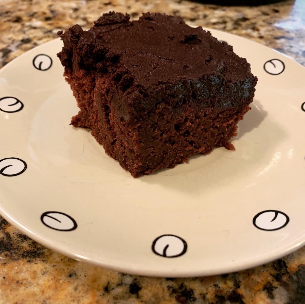 6) When the cake is completely cool, spread the fudgy frosting over top the cake until all available real estate is covered. Slice, serve, and enjoy!