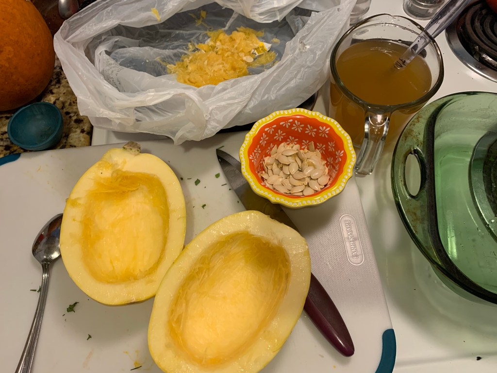 1) Preheat oven to 400°. Cut the squash in half lengthwise and scoop out the seeds.