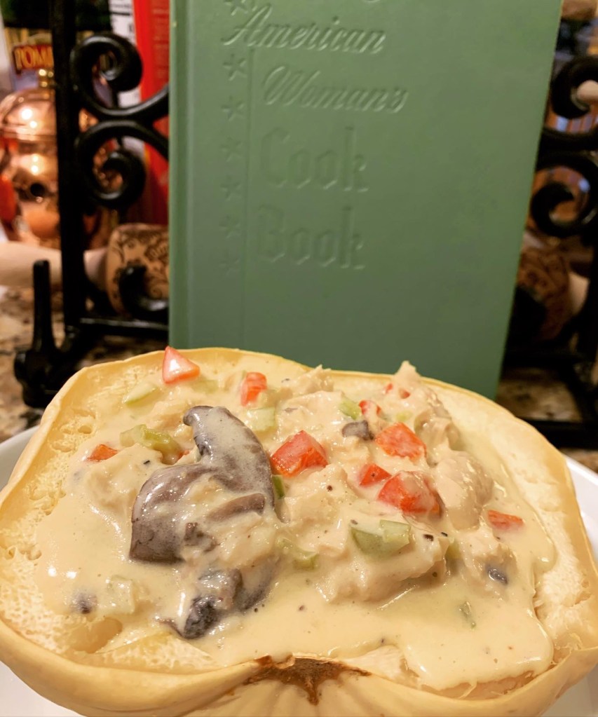 The interesting this about vintage cook books is that many of the recipes are fine on their own or give options to build onto in order to round out the meal. I was angling to use up the last of my store of Winter squash (a beautiful white pumpkin!) and while poring through the annals of my cook book collection, I came across a recipe for something called “Squash in the Shell.” I used part of this recipe to build on to make an even fuller meal as per the suggestion in the book. The recommendation in this recipe was to bake off the squash (sans seeds) and fill the remaining cavities with Chicken à la King.