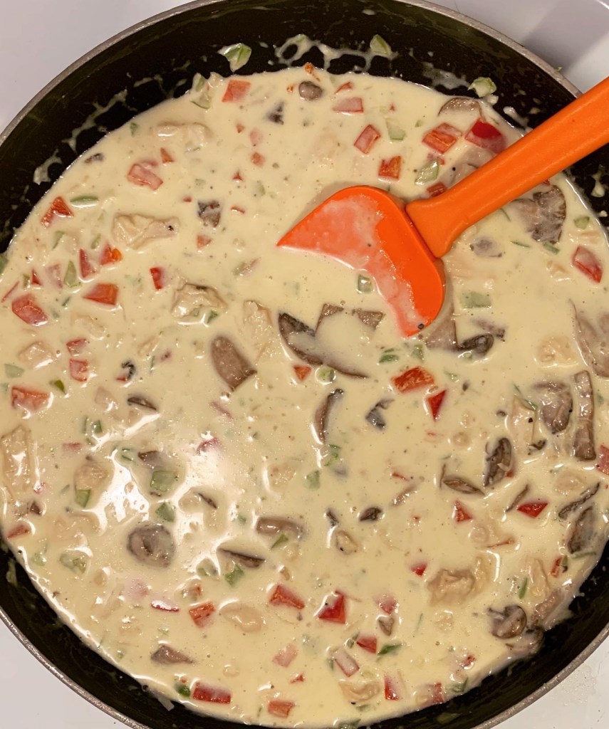 If you prefer a more umami flavor to the sweet ones that were favored during the 50s and 60s, you can swap the sherry for another cooking wine (I’m a big fan of Holland House‘s line of cooking wines). Or, if you’d prefer not to use wine at all, feel free to swap out the wine with more broth, cream, or even water! I will also note that though the recipe calls for diced pimiento, I opted for finely diced red bell pepper. A pimiento is a small, heart-shaped, sweet-fleshed pepper. It’s smaller and sweeter than a bell pepper, but my local market was fresh out of pimientos so a small red bell pepper came to play. Sure it means more pepper in the dish overall, but I love red bell peppers and they added more bulk and flavor!