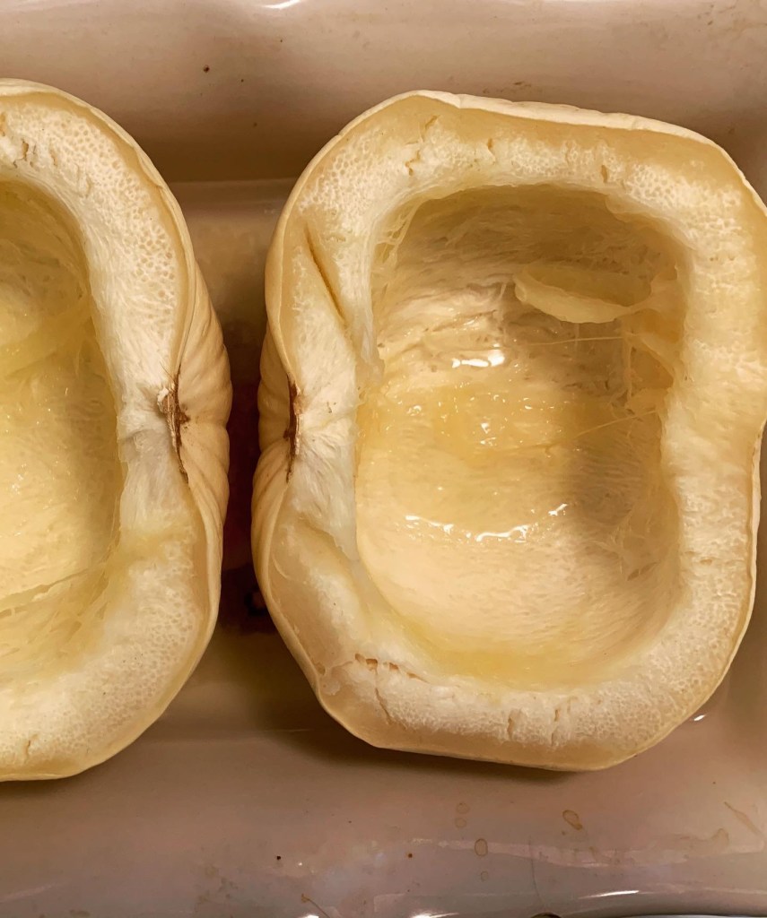 6) Stir sherry into mixture and serve over hot, cooked noodles or freshly baked biscuits (or in our case cooked squash halves. Cut the squash in half. Scoop out the seeds. Place the two halves cut-side-down in a baking dish with 2c of water or broth. Bake at 400º for 1.5hrs. Flip and bake 30min more).