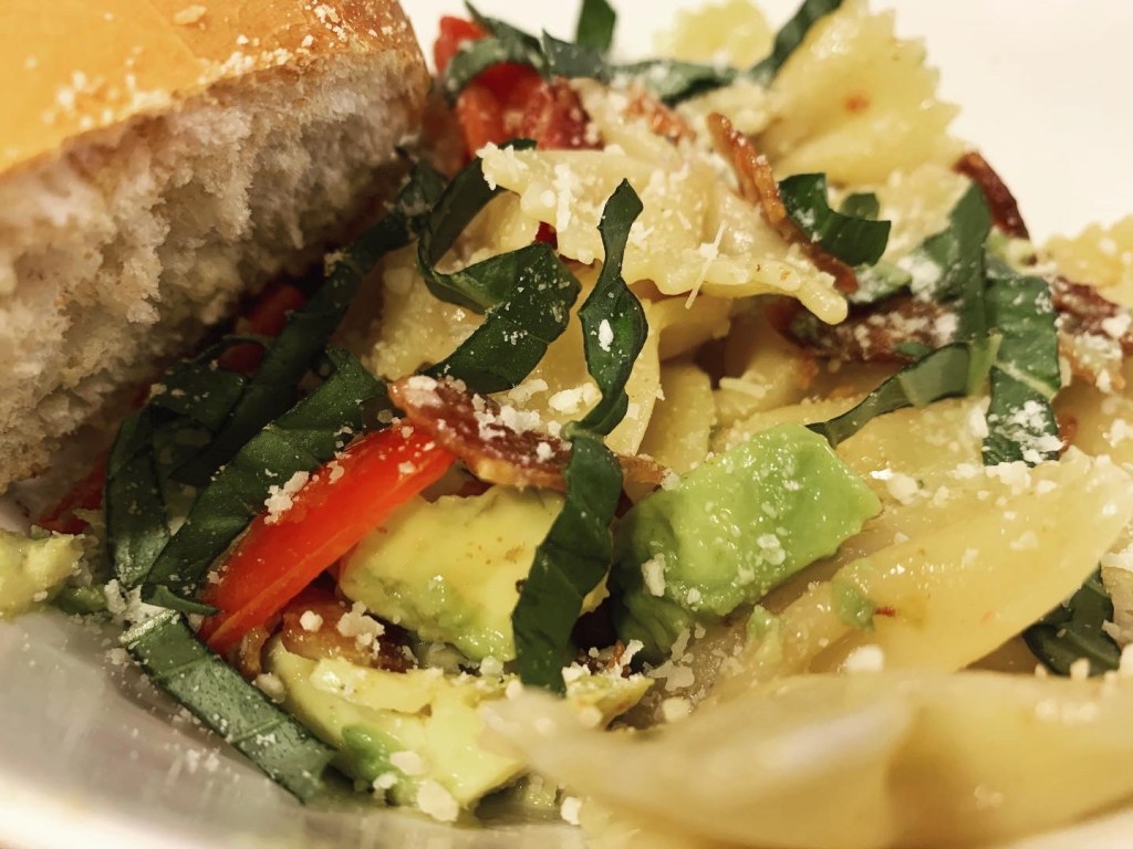 In addition to this, I was able to add my own spin to the dish. I was able to improve upon the original concept with the use of a roasted garlic compound butter (a recent gift from a friend in trade for some banana bread). The original dish is absolutely perfect just the way it is, don’t get me wrong. However, I couldn’t miss an opportunity to use elevated ingredients. The original description reads: Penne pasta tossed with lean bacon, fresh avocado, diced tomatoes, fresh basil and parmesan cheese. It seems fairly basic, but I assure you that it is quite lovely!