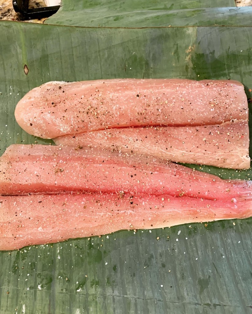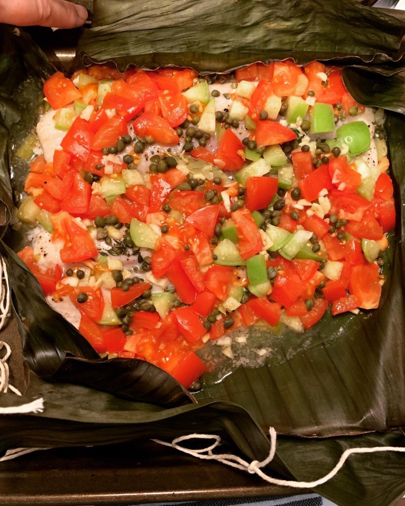 2) On a lg baking sheet, lay banana leaves flat, side-by-side or crosswise, to create a wrapper big enough to completely enclose the fish. Place fish of choice in the center and season with salt, two sprigs of thyme leaves, and the bay. Layer on the tomatillos, tomatoes, garlic, and capers. Wrap leaves around contents. If you need to secure the bundle with baking twine, like me, feel free! The object is just to make sure everything stays together.