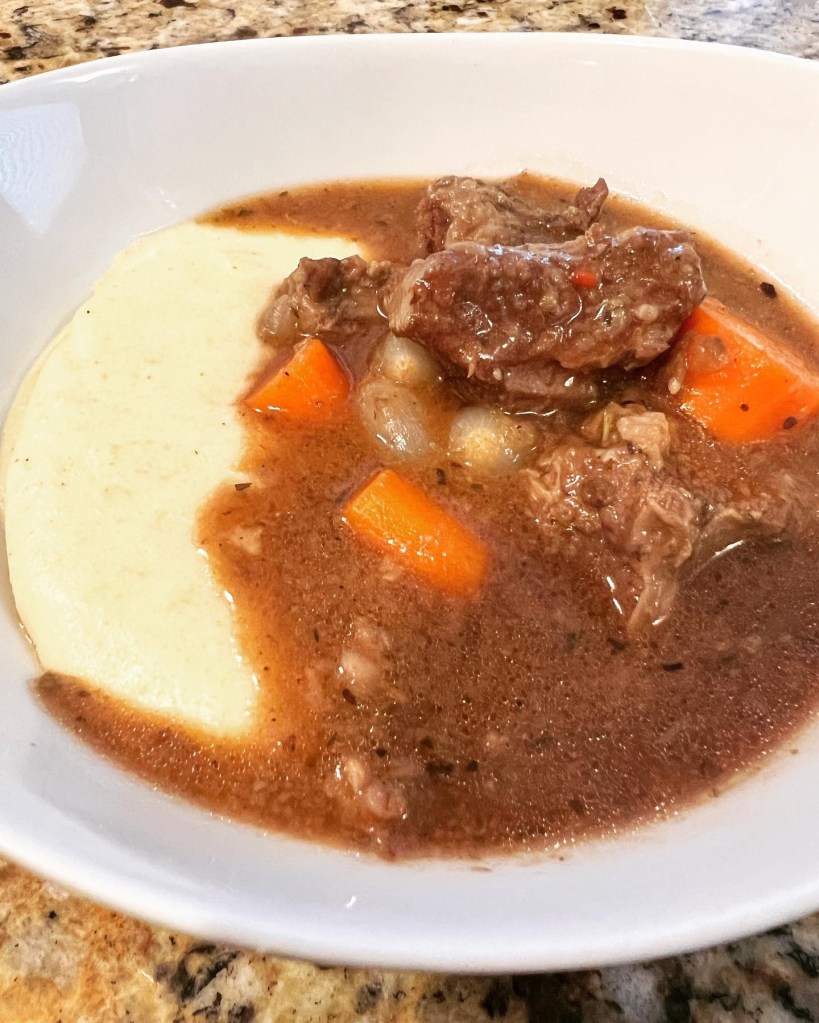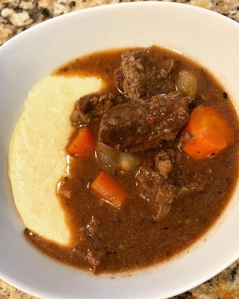 Beef stew is typically served with some sort of comfort-bearing carb such as wide egg noodles or hot, cooked white potatoes or even rice. Dinner rolls do nicely to sop up all the jus when you’re finished even. These are all just fine. Even Julia served hers with potatoes, Nothing wrong with that. However, finding a new pillow to nestle the succulent, stewed beef and veg is welcome too. Enter Better Homes and Gardens‘ recipe for Polenta Beef Stew. Polenta is a personal favorite in our house. The Northern Italian grits-like dish is usually made by whisking cornmeal into boiling water to make a corn porridge. However, in this instance, the polenta is cooked in hot milk. The result was revolutionary. To me that is. Have I been making polenta wrong this whole time?! I don’t think so. Mine always turns out perfectly creamy. This cooking polenta in milk idea though may be my go-to for all future polentas.